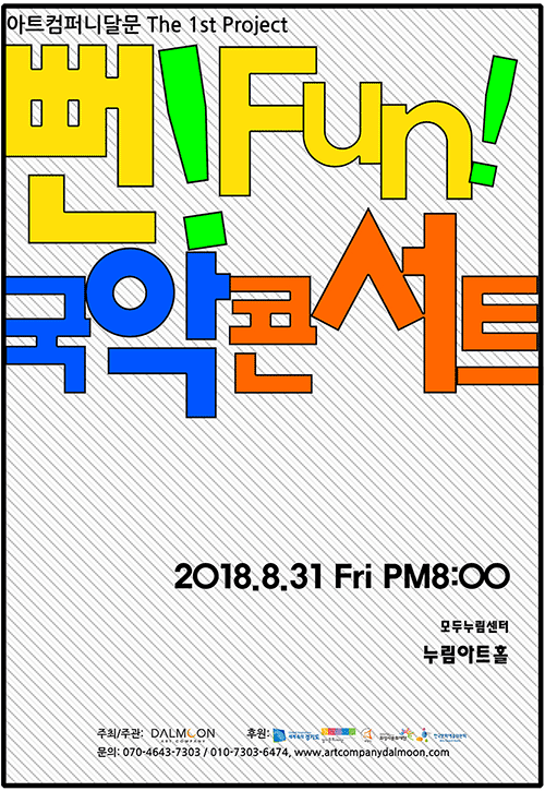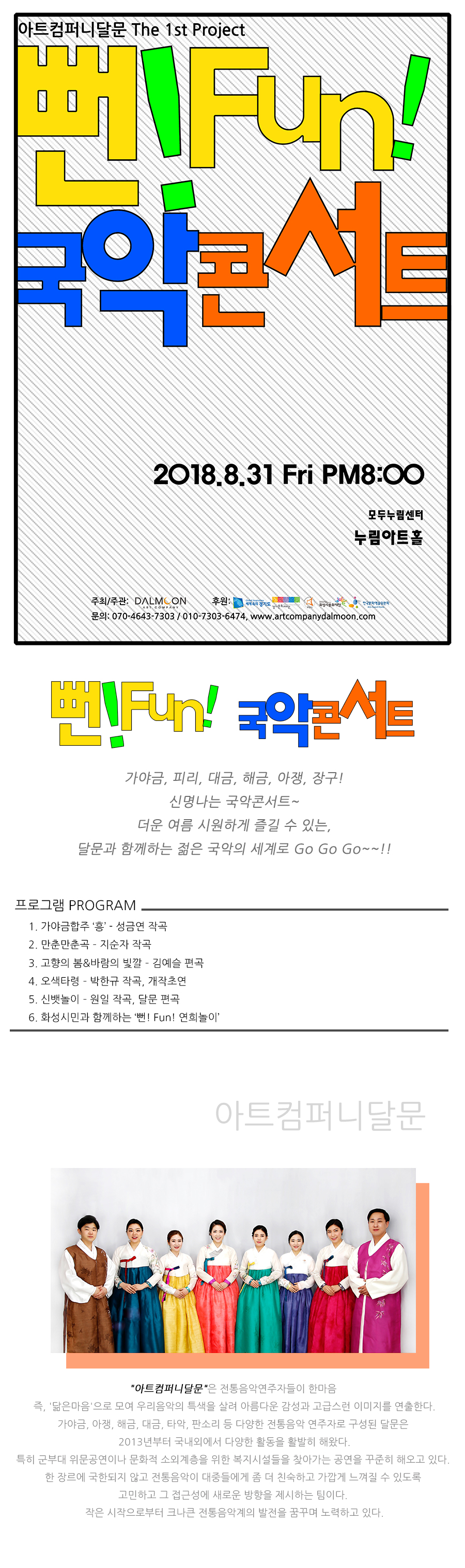 【[공 연]대관공연】뻔!펀! 국악콘서트 장소 누림아트홀 기간 2018년 8월 31일 ~ 2018년 8월 31일 공연시간 8월 31일(금) 20시 티켓정보 전석 무료 관람등급 문의 070-4643-7303 . 뻔뻔국악콘서트.gif [ Size : 163.08KB, Down : 419 ] 미리보기 다운로드 ???????????????????(0831).jpeg [ Size : 1.12MB, Down : 740 ] 미리보기 다운로드 목록보기