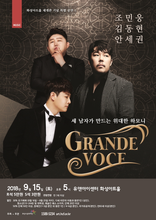 【[공 연]기획공연】화성아트홀 재개관기념 특별기획1 그란데보체 장소 화성아트홀 기간 2018년 9월 15일 ~ 2018년 9월 15일 공연시간 2018년 9월 15일 17시 티켓정보 R석 50,000원 / S석 30,000원 관람등급 만 7세 이상 문의 1588-5234 . . 그란데보체-180x120-외부.jpg [ Size : 53.52KB, Down : 423 ] 미리보기 다운로드 크기변환_426X600그란데보체-도련포함.jpg [ Size : 227.06KB, Down : 397 ] 미리보기 다운로드 18_그란데보체_화성___상세페이지.jpg [ Size : 581.16KB, Down : 1,007 ] 미리보기 다운로드 목록보기