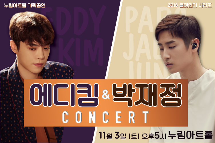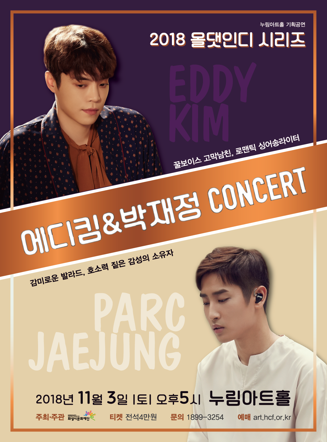 ![누림아트홀 기획공연, 2018 올댓인디 시리즈, EDDY KIM, 꿀보이스 고막남친, 로맨틱 싱어송라이터, 에디킴&박재정 CONCERT, 감미로운 발라드, 호소력 짙은 감성의 소유자, PARK JAEJUNG, 2018년 11월 3일 (토) 오후 5시, 누림아트홀, 주최ㆍ주관 (재)화성시문화재단, 티켓 전석4만원, 문의 1899-3254, 예매 art.hcf.or.kr , 공연 소개, 꿀보이스 고막남친, 로맨틱 싱어송라이터, 에디킴, 에디킴은 2012년 방영된 Mnet <슈퍼스타K4>에서 TOP6에 오르며 이름을 알렸다. 출연 당시 에디킴은 버클리 음대 출신으로 화제를 모았으며, 뛰어난 기타 실력과 자각곡들로 음악적 기량이 상당하다는 평가를 받았다. 2013년 미스틱엔터테인먼트에 합류한 에디킴은 2014년 4월, 직접 작사, 작곡, 프로듀싱까지 한 첫 번째 미니 앨범 [너 사용법]으로 정식 데뷔했다. 1집 타이틀곡 너 사용법은 각종 음원 차트에서 롱런하며 현재까지도 인기 몰이 중이며, 이후 팔당댐, 내 입술 따뜻한 커피처럼(Feat.이성경), tvN드라마 <도깨비> OST 이쁘다니까 등 여러 히트곡을 발표해 대중적으로 큰 사랑을 받고 있다. 감미로운 발라드, 호소력 짙은 감성의 소유자, 박재정, 박재정은 2013년 Mnet <슈퍼스타K5>의 우승자로, 당시 안정적인 무대, 중저음의 선 굵은 목소리와 호소력 짙은 깊은 감성으로 대중에게 이름을 알렸다. 그는 2014년 7월, 첫 미니앨범 [STEP 1]을 발표하며 정식 데뷔했다. 2015년 미스틱엔터테인먼트에 합류한 박재정은 다음해 슈퍼주니어 규현과 함께 한 두 남자를 시작으로 여권, 시력, 악역 등 감미로운 발라드를 선보이며 차세대 발라더로서 존재감을 보여주고 있다. , 예정 프로그램, 에디킴, 너 사용법, 팔당댐, 내 입술 따뜻한 커피처럼, 이쁘다니까(도깨비 OST), 박재정, 가사, 여권, 시력, 악역, 누림아트홀 오시는 길, 대중교통 이용시, 수원역, 22-1번(제부여객) 수원역(안산방향정류장), 오산, 동탄.병점.봉담 , 남양여객, 시원운수, 자가용 인천, 서울, 수원, 오산, 주차안내, 주차장운영 : 06:00~22:00, 주차대수: 지상 149대, 지하2층 65대, 예매문의 1899-3254, 인터넷 예매 art.hcf.or.kr.jpg](/File/Download/9014ed8ca17811baf1f9981c686b99e1)
