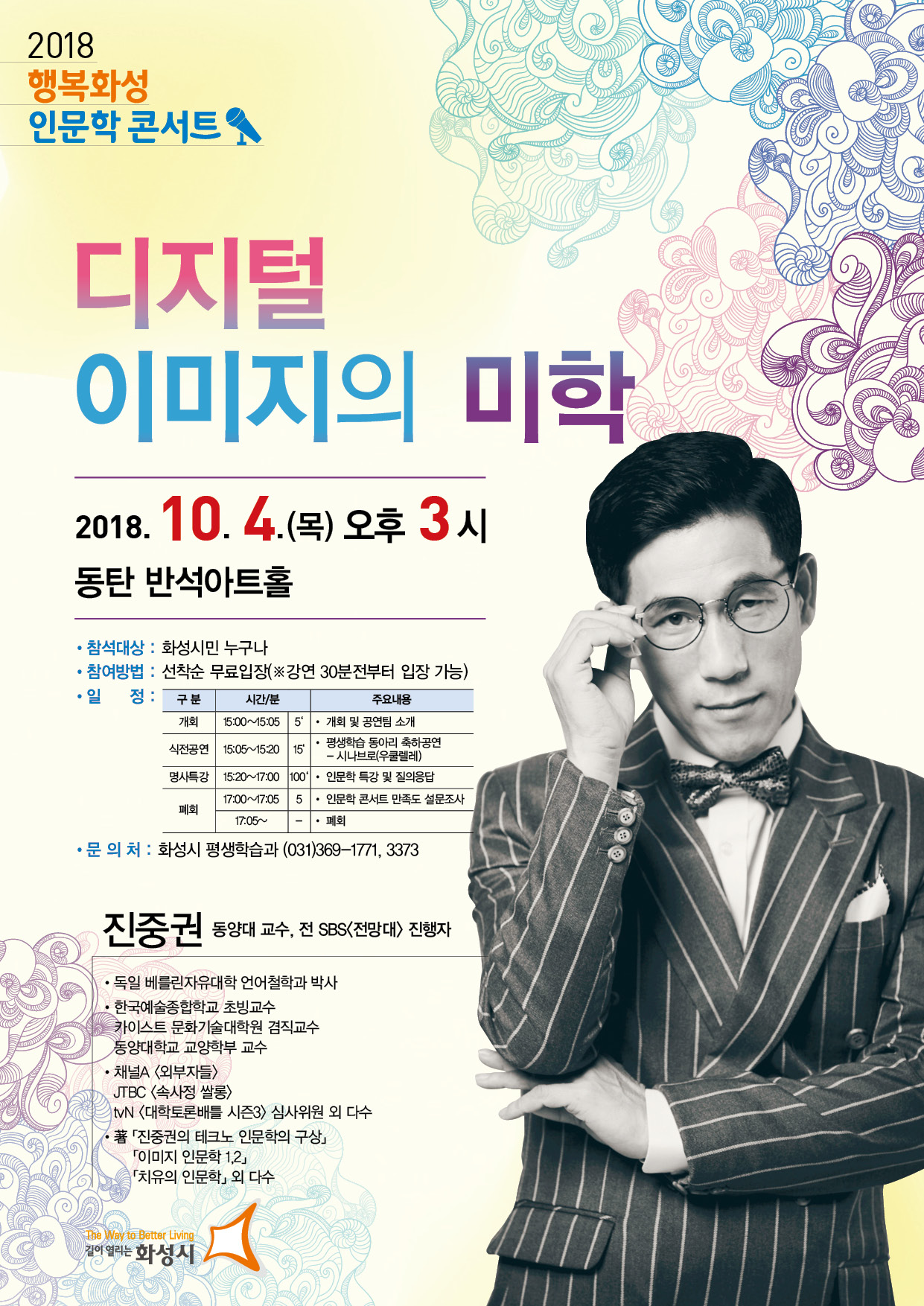 【[공 연]대관공연】행복화성 인문학콘서트 장소 반석아트홀 기간 2018년 10월 4일 ~ 2018년 10월 4일 공연시간 오후3시 티켓정보 선착순 무료 관람등급 전체관람가 문의 화성시 평생학습과 031)369-1771,3373 - 제1회 행복화성 인문학콘서트-진중권.jpg [ Size : 680.82KB, Down : 372 ] 미리보기 다운로드 목록보기
