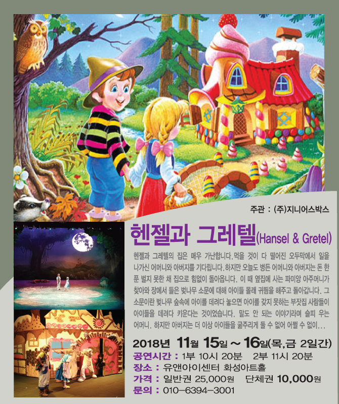 【[공 연]대관공연】헨젤과 그레텔 장소 화성아트홀 기간 2018년 11월 15일 ~ 2018년 11월 16일 공연시간 10:00/ 11:10 티켓정보 일반25,000원 / 단체 10,000원 관람등급 만3세 이상 문의 031-703-0468 - 기본이미지배너 지니어스.jpg [ Size : 104.3KB, Down : 378 ] 미리보기 다운로드 기본이미지배너 지니어스.jpg [ Size : 104.3KB, Down : 373 ] 미리보기 다운로드 상세내용 이미지.jpg [ Size : 569.81KB, Down : 688 ] 미리보기 다운로드 목록보기