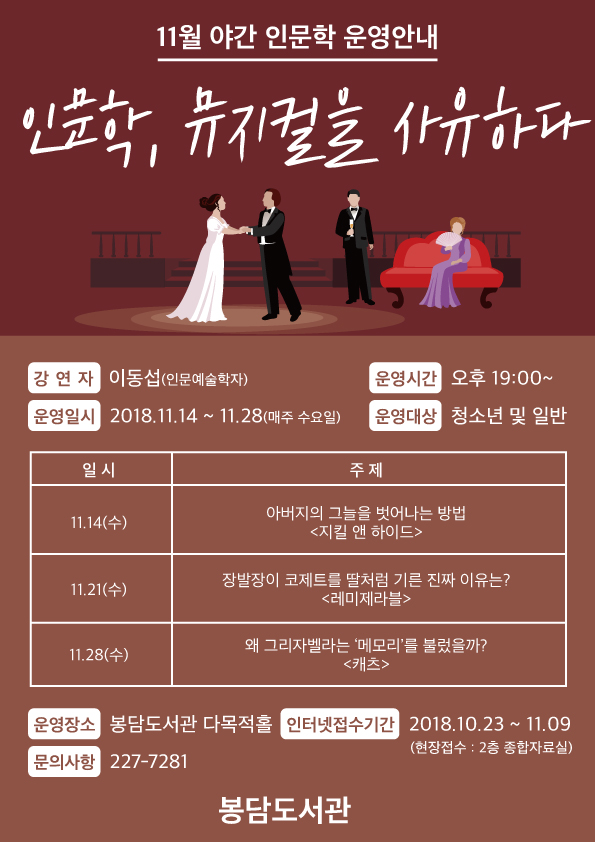 【[기 타] 행사】인문학, 뮤지컬을 사유하다 장소 봉담도서관 다목적홀 기간 2018년 11월 28일 ~ 2018년 11월 28일 공연시간 티켓정보 관람등급 문의 031-227-7281 인문학, 뮤지컬을 사유하다봉담도서관 다목적홀031-227-7281 뮤지컬.png [ Size : 20.03KB, Down : 279 ] 미리보기 다운로드 a4-11월-야간-인문학1.jpg [ Size : 218.54KB, Down : 291 ] 미리보기 다운로드 a4-11월-야간-인문학1.jpg [ Size : 218.54KB, Down : 327 ] 미리보기 다운로드 목록보기