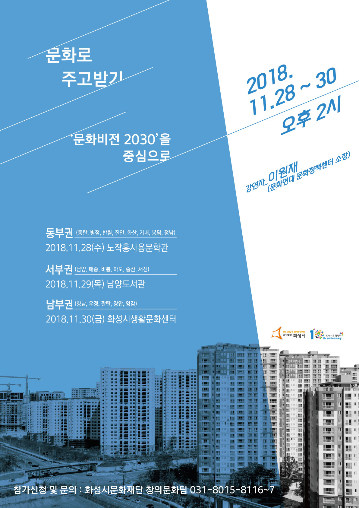 화성시문화재단은 문화체육관광부의 새로운 문화예술정책인 ‘사람이 있는 문화-문화비전2030’을 바탕으로 화성시 26개 읍·면·동의 다양한 문화주체들과 민관협력 추진체계를 구축하고자 시민누구에게나 열린 시민역량강화 프로그램 [오픈세미나]를 개최합니다.