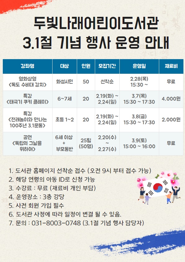 【[기 타] 행사】'독립의 그날을 위하여' 두빛나래어린이도서관 3.1절 기념 공연 장소 두빛나래어린이도서관 기간 2019년 3월 9일 ~ 2019년 3월 9일 공연시간 15:00~16:00 티켓정보 관람등급 문의 031-8003-0748 '독립의 그날을 위하여' 두빛나래어린이도서관 3.1절 기념 공연 삼일절기념행사.png [ Size : 41.88KB, Down : 247 ] 미리보기 다운로드 3_1절%20행사%20운영.jpg [ Size : 210.88KB, Down : 332 ] 미리보기 다운로드 목록보기