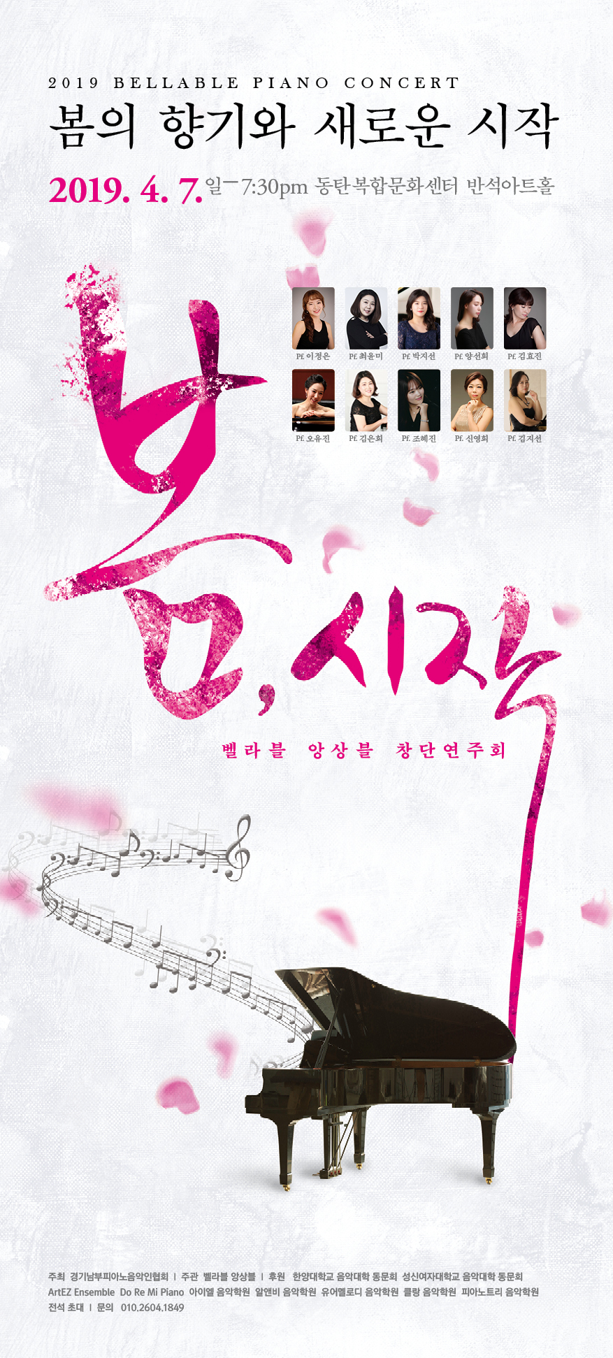 【[공 연]대관공연】경기 남부 피아노음악인 창단연주회 장소 반석아트홀 기간 2019년 4월 7일 ~ 2019년 4월 7일 공연시간 19:30 티켓정보 전석초대 관람등급 만7세 이상 문의 010.2604.1849 - 벨라블-프로그램시안.jpg [ Size : 4.04MB, Down : 727 ] 미리보기 다운로드 벨라블-포스터시안.jpg [ Size : 1.14MB, Down : 287 ] 미리보기 다운로드 목록보기
