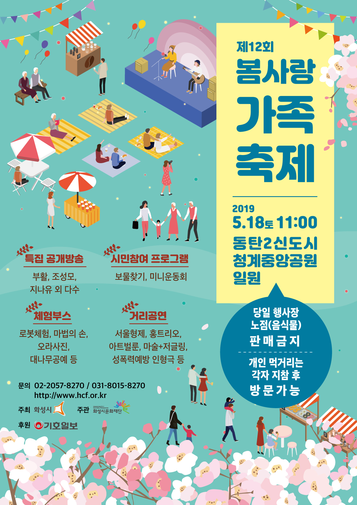 【[축 제]봄 사랑 가족축제】제 12회 봄사랑가족축제 장소 동탄2신도시 청계중앙공원 일원 기간 2019년 5월 18일 ~ 2019년 5월 18일 공연시간 11:00 티켓정보 관람등급 문의 02-2057-8270 / 031-8015-8270 제 12회 봄사랑가족축제 봄사랑가족축제_180x120.jpg [ Size : 14.09KB, Down : 521 ] 미리보기 다운로드 제12회 봄사랑가족축제_poster.jpg [ Size : 1005.4KB, Down : 2,725 ] 미리보기 다운로드 제 12회 봄사랑가족축제,장소:동탄2신도시 청계중앙공원 일원 ,기간:2019년 5월 18일 ~ 2019년 5월 18일 목록보기