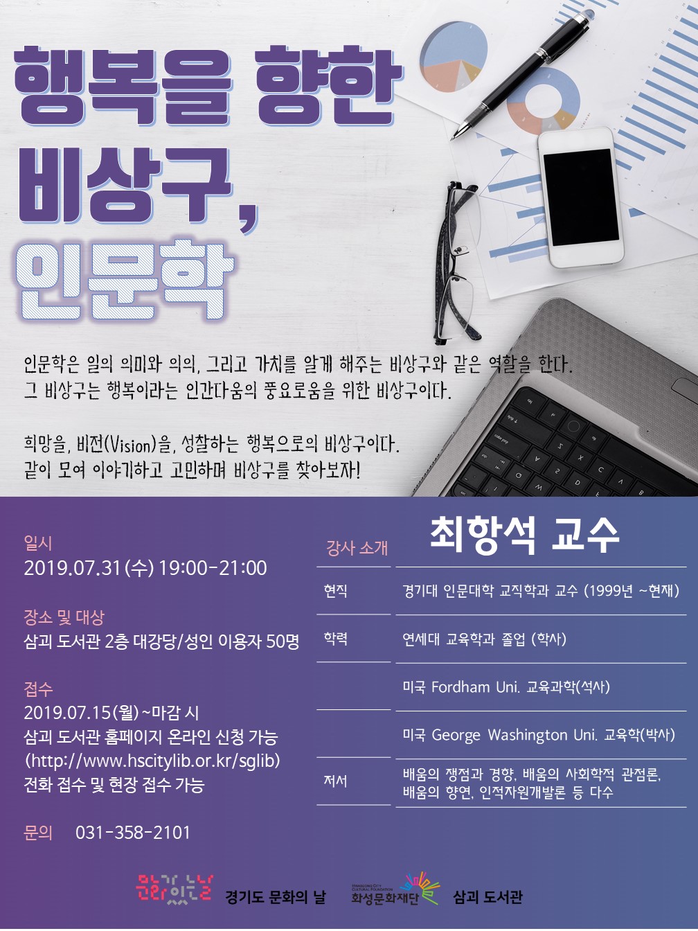 【[기 타] 행사】행복을 향한 비상구, 인문학 장소 삼괴도서관 2층대강당 기간 2019년 7월 31일 ~ 2019년 7월 31일 공연시간 19:00~21:00 티켓정보 관람등급 전체 문의 031-358-2101 행복을 향한 비상구, 인문학http://www.hscitylib.or.kr/lectureView.do?LIBCODE=SGLIB&LECTCODE=cult&pageNo=1&idx=9326 행복인문학.png [ Size : 44.88KB, Down : 159 ] 미리보기 다운로드 행복을향한인문학비상구.JPG [ Size : 281.53KB, Down : 154 ] 미리보기 다운로드 행복을향한인문학비상구.JPG [ Size : 281.53KB, Down : 207 ] 미리보기 다운로드 목록보기