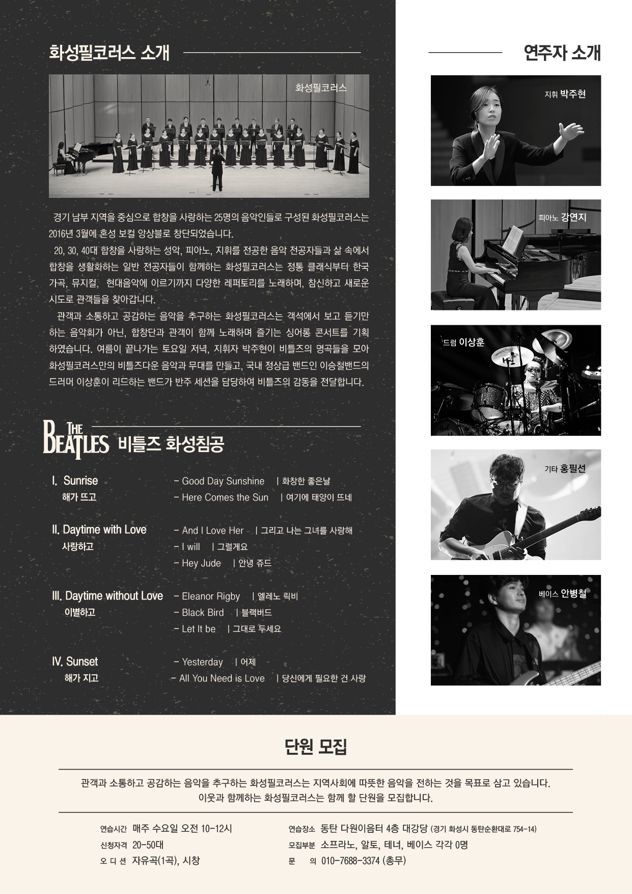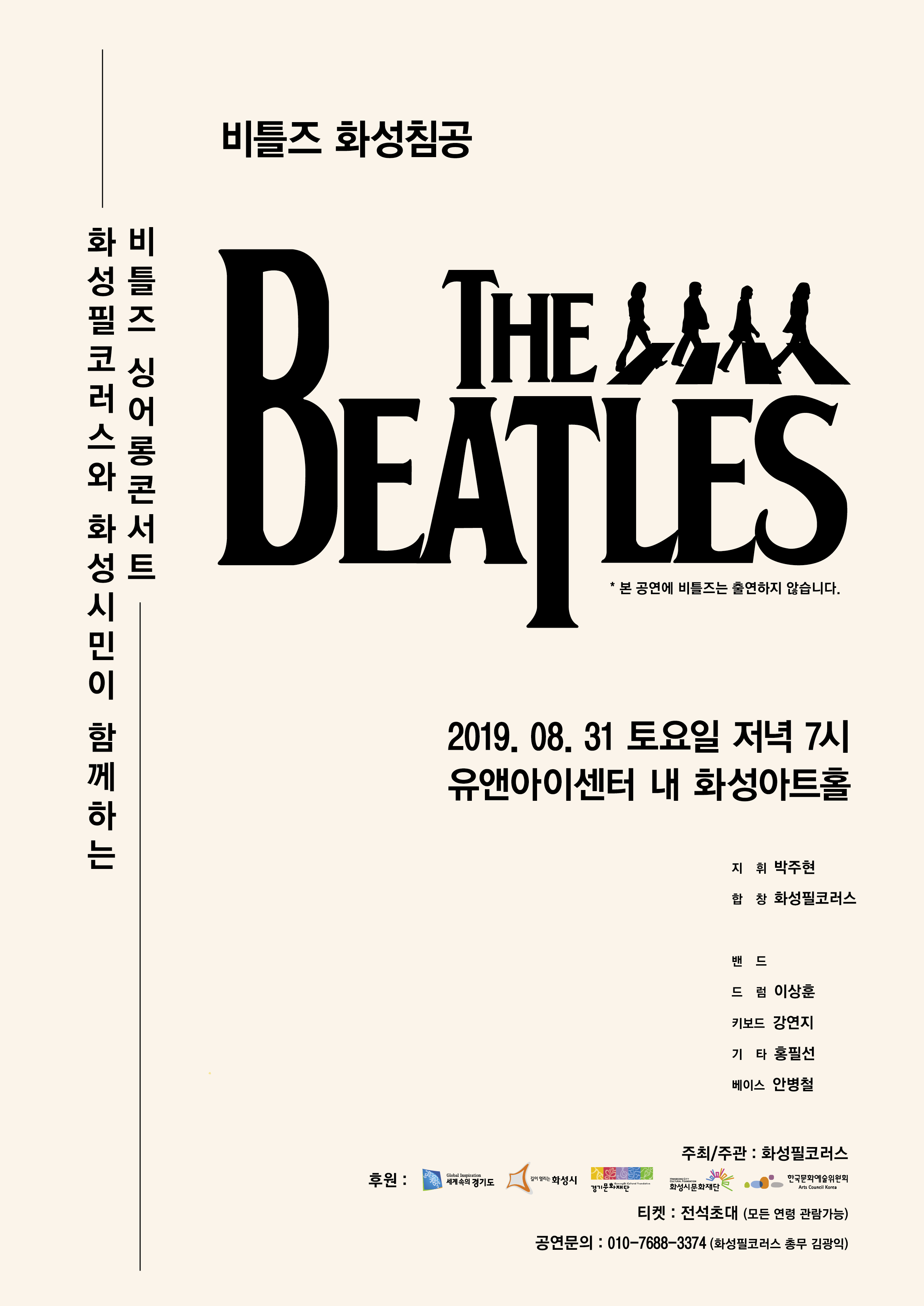 【[공 연]대관공연】화성필코러스와 화성시민이 함께하는 <비틀즈 화성침공> 싱어롱 콘서트 장소 유앤아이센터 화성아트홀 기간 2019년 8월 31일 ~ 2019년 8월 31일 공연시간 19:00 티켓정보 전석무료 관람등급 전체관람가 문의 화성필코러스 010.7688.3374 - 비틀즈화성침공_전단지및포스터앞면.JPG [ Size : 1.1MB, Down : 134 ] 미리보기 다운로드 비틀즈화성침공_전단지및포스터앞면.JPG [ Size : 1.1MB, Down : 400 ] 미리보기 다운로드 사본 -비틀즈화성침공_전단지뒷면.jpg [ Size : 906.14KB, Down : 365 ] 미리보기 다운로드 목록보기