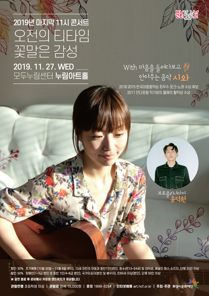 【[공 연]기획공연】오전의 티타임 꽃말은 감성〈시와X윤덕원〉 장소 누림아트홀 기간 2019년 11월 27일 ~ 2019년 11월 27일 공연시간 70분 티켓정보 전석 15,000원 관람등급 초등학생 이상 문의 1899-3254 티켓오픈 10월 30일(수) 오전 10시 11월 11시콘서트 80x120-홈페이지-외부.jpg [ Size : 1.33MB, Down : 144 ] 미리보기 다운로드 11시콘서트-11월-포스터a2(90장)ol.jpg [ Size : 697.32KB, Down : 142 ] 미리보기 다운로드 11월_11시콘서트-상세페이지ol.jpg [ Size : 3.23MB, Down : 1,443 ] 미리보기 다운로드 목록보기