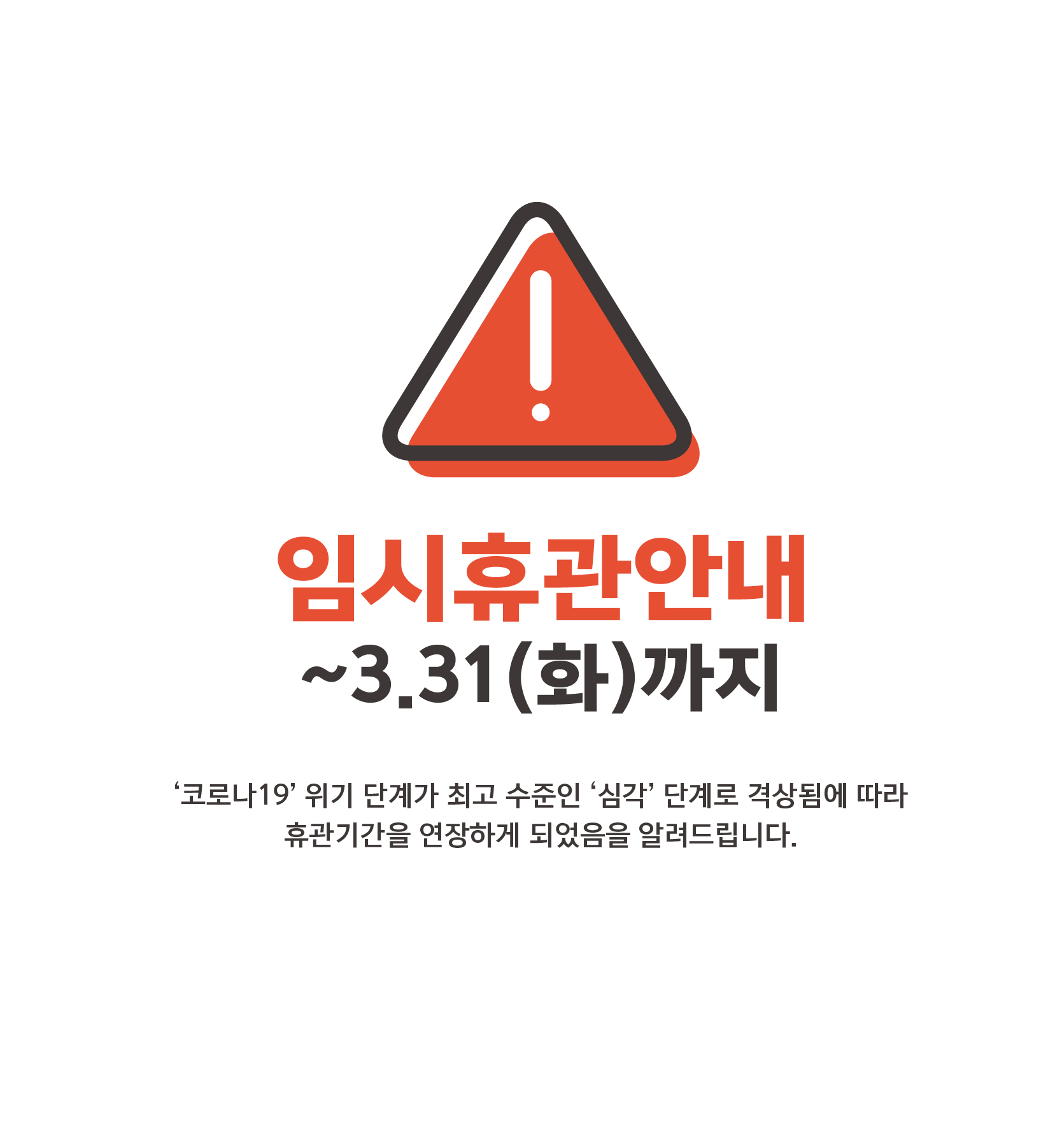 ‘코로나19’ 위기 단계가 최고 수준인 ‘심각’ 단계로 격상됨에 따라 임시휴관을 하게 되었음을 알려드립니다.