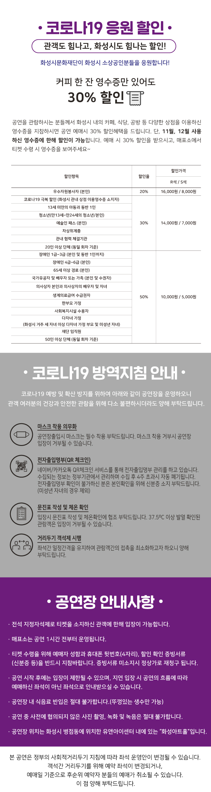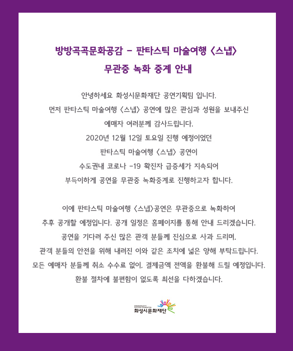 【[공 연]기획공연】방방곡곡문화공감 - 판타스틱 마술여행 <스냅> 장소 화성아트홀 기간 2020년 12월 12일 ~ 2020년 12월 12일 공연시간 약 70분 티켓정보 R석 2만원 관람등급 전체관람가 문의 1588-5234 화성시문화재단 유튜브 채널 바로가기 https://www.youtube.com/channel/UCuA-HTwc41V0Xv-1zydoHYA . 스냅-180x120-외부.jpg [ Size : 1.35MB, Down : 100 ] 미리보기 다운로드 스냅-180x120-외부.jpg [ Size : 1.35MB, Down : 73 ] 미리보기 다운로드 상세페이지2.jpg [ Size : 672.78KB, Down : 2,809 ] 미리보기 다운로드 상세페이지1.jpg [ Size : 1.64MB, Down : 2,850 ] 미리보기 다운로드 취소안내.jpg [ Size : 130.37KB, Down : 198 ] 미리보기 다운로드 목록보기