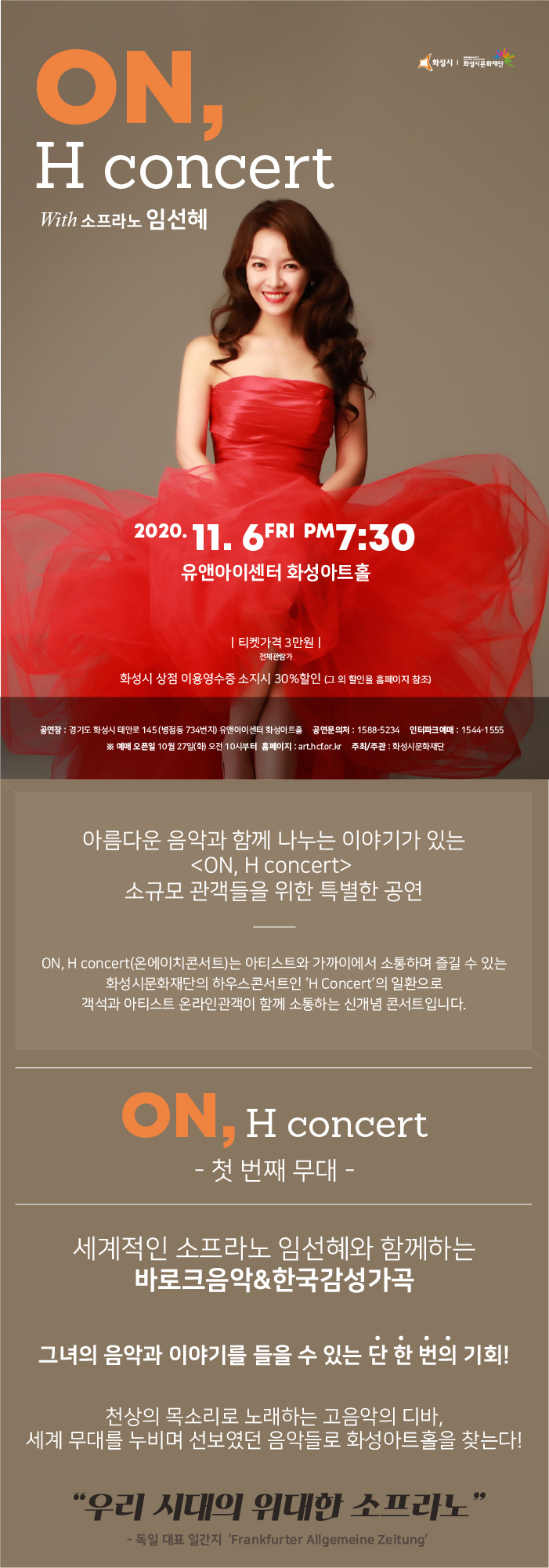 【[공 연]기획공연】ON, H concert with 임선혜 장소 화성아트홀 기간 2020년 11월 6일 ~ 2020년 11월 6일 공연시간 약 90분 티켓정보 전석 3만원 관람등급 만 7세 이상 문의 1588-5234 티켓 오픈은 2020년 10월 27일 오전 10시 부터 입니다.감사합니다. . 270_180-홈페이지-타이틀.jpg [ Size : 10.43KB, Down : 99 ] 미리보기 다운로드 270_180-홈페이지-타이틀.jpg [ Size : 10.43KB, Down : 85 ] 미리보기 다운로드 202010270905210009.jpg [ Size : 628.73KB, Down : 1,083 ] 미리보기 다운로드 202010270905420009.jpg [ Size : 613.91KB, Down : 1,073 ] 미리보기 다운로드 목록보기