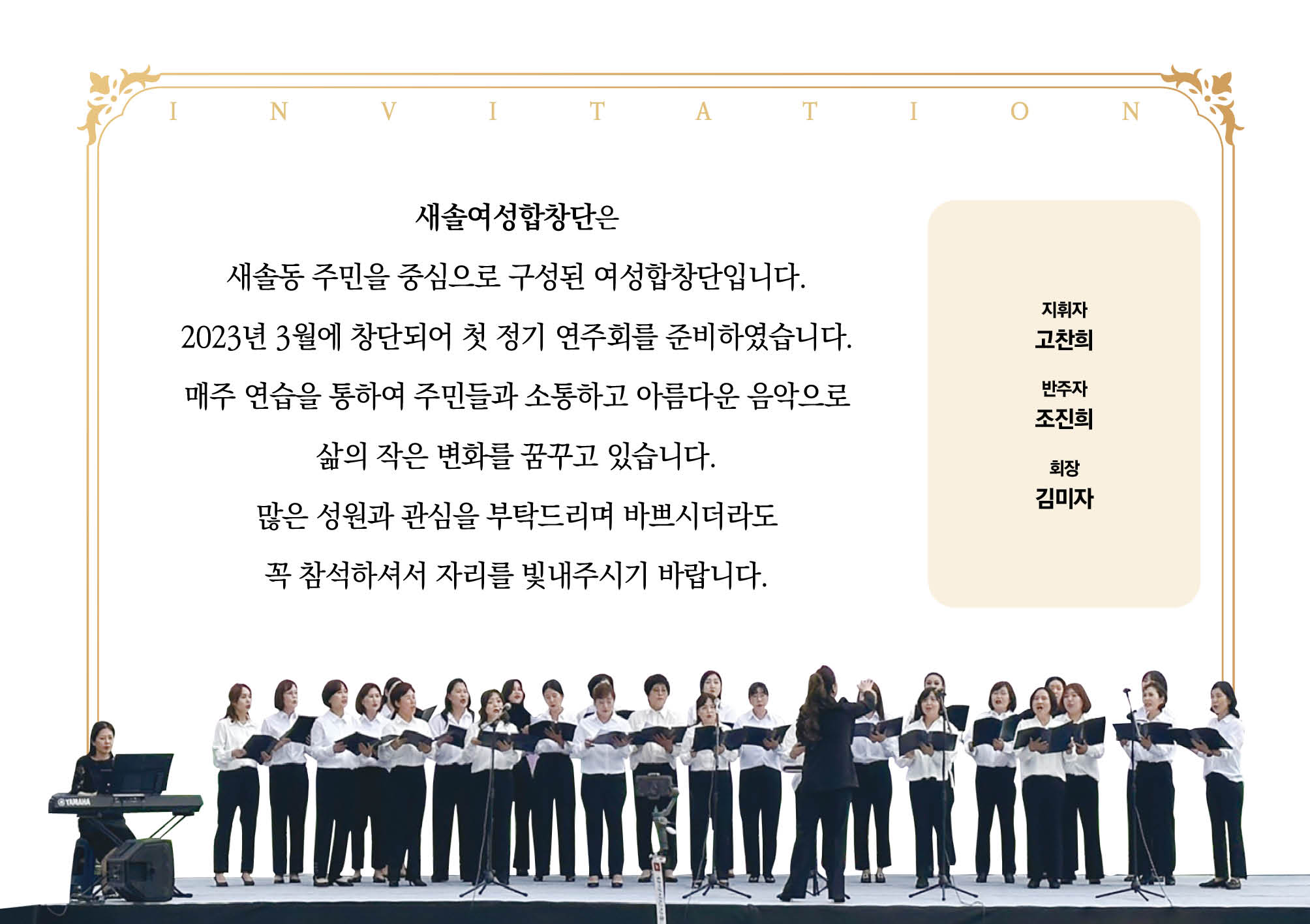 【[공 연]대관공연】새솔여성합창단 제1회 정기연주회 장소 모두누림센터 누림아트홀 기간 2024년 3월 16일 ~ 2024년 3월 16일 요일 토 공연시간 60분 티켓정보 전석무료 관람등급 전체관람가 문의 031-8077-이삼칠삼 누림아트홀 대관공연입니다.공연문의 : 031-8077-이삼칠삼 1709536962682.jpg [ Size : 234.48KB, Down : 710 ] 미리보기 다운로드 1709536962682 1709536962682.jpg [ Size : 234.48KB, Down : 917 ] 미리보기 다운로드 1709536962682 1709536954683.jpg [ Size : 218.43KB, Down : 916 ] 미리보기 다운로드 1709536954683 목록보기