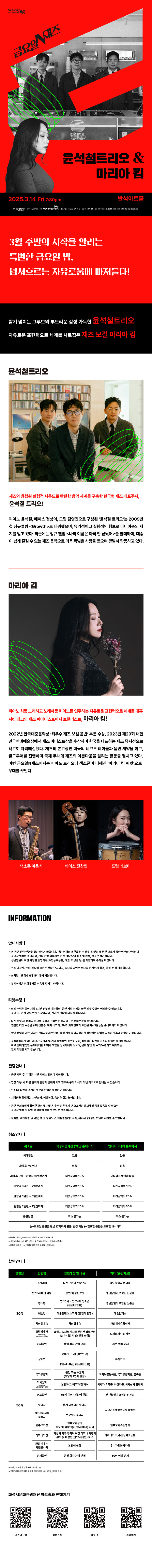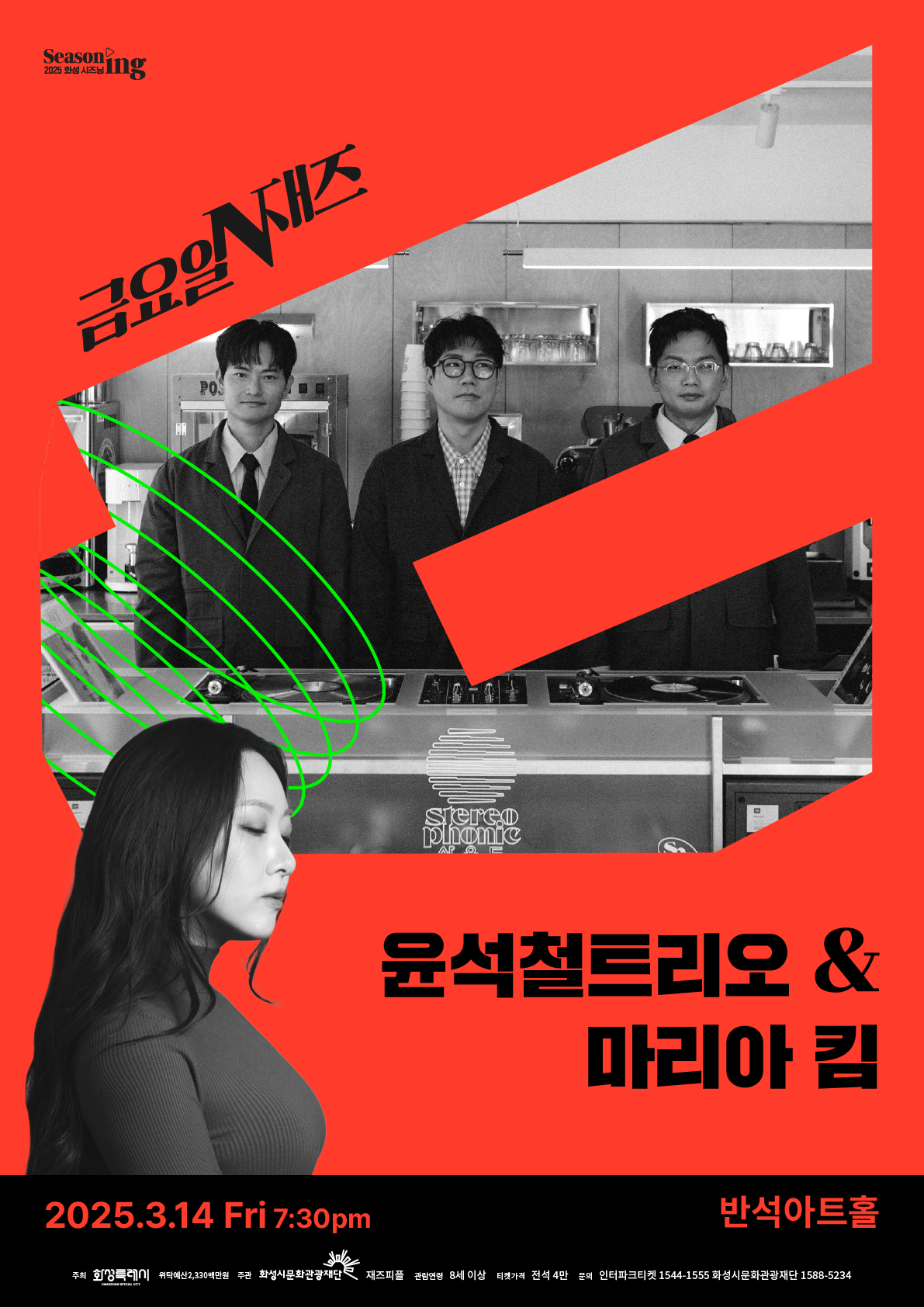 【[공 연]기획공연】금요일N재즈 <윤석철트리오 & 마리아킴> 장소 반석아트홀 기간 2025년 3월 14일 ~ 2025년 3월 14일 요일 금 공연시간 19:30(90분) 티켓정보 전석 4만원 관람등급 8세 이상 관람가 문의 1588-5234 ※예매 바로가기 버튼은 2월 4일(화) 11시에 활성화됩니다. (03.14)윤석철트리오_아트홀목록이미지.png [ Size : 48.42KB, Down : 256 ] 미리보기 다운로드 (03.14)윤석철트리오_아트홀목록이미지 (25.03.14) 금요일N재즈_윤석철트리오&마리아 킴.jpg [ Size : 951.58KB, Down : 273 ] 미리보기 다운로드 (25.03.14) 금요일N재즈_윤석철트리오&마리아 킴 상세페이지_금요일N재즈.jpg [ Size : 902.9KB, Down : 1,506 ] 미리보기 다운로드 상세페이지_금요일N재즈 목록보기