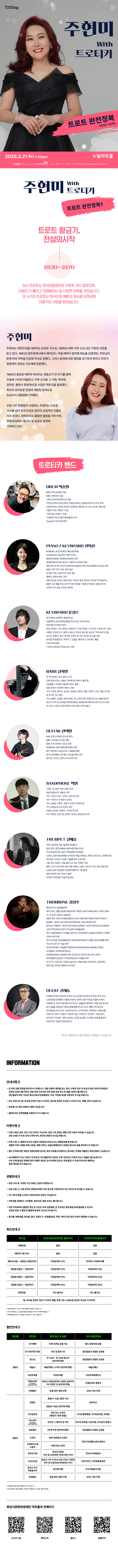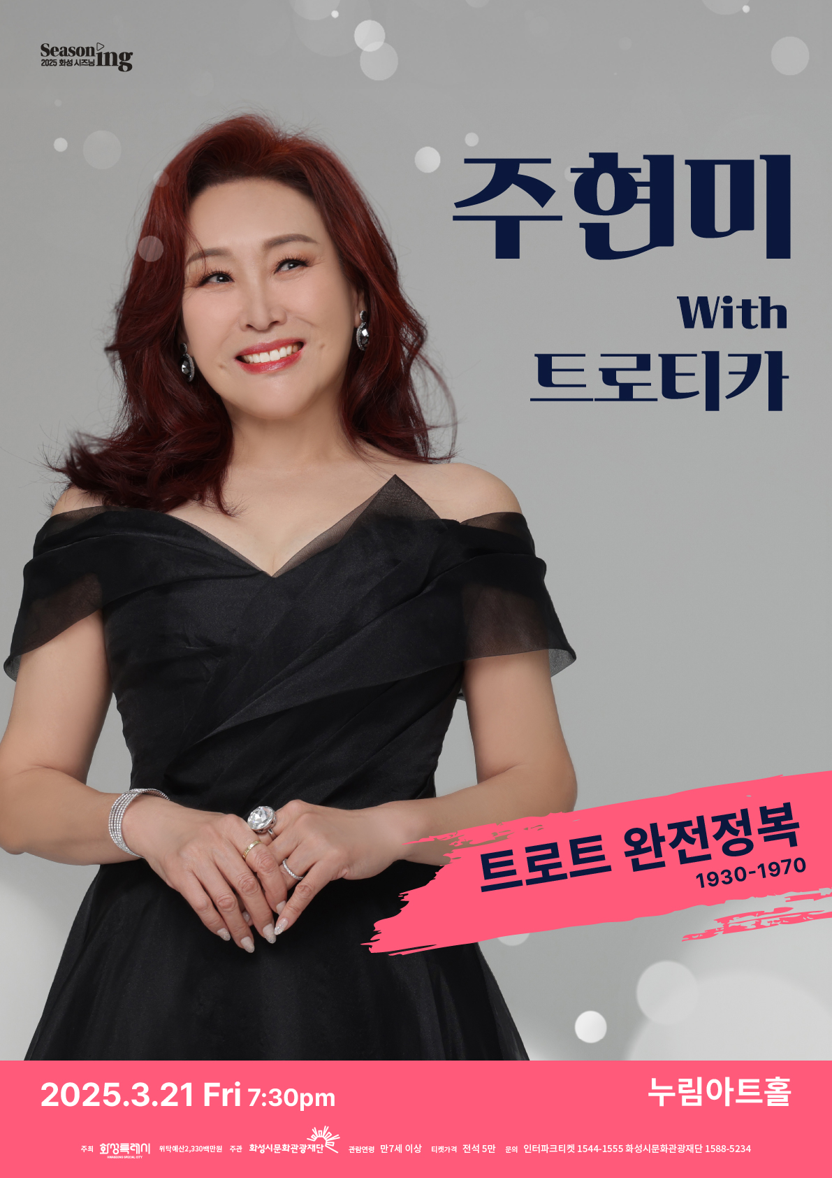 【[공 연]기획공연】주현미 with 트로티카 <트로트 완전정복1> 장소 누림아트홀 기간 2025년 3월 21일 ~ 2025년 3월 21일 요일 금 공연시간 19:30(80분) 티켓정보 전석 5만원 관람등급 만 7세 이상 관람가 문의 1588-5234 ※예매 바로가기 버튼은 2월 4일(화) 11시에 활성화됩니다. (03.21)주현미1_아트홀목록.jpg [ Size : 93.7KB, Down : 358 ] 미리보기 다운로드 (03.21)주현미1_아트홀목록 (25.03.21) 주현미 with 트로티카.jpg [ Size : 895.82KB, Down : 367 ] 미리보기 다운로드 (25.03.21) 주현미 with 트로티카 상세페이지_주현미-3월.jpg [ Size : 1.02MB, Down : 3,096 ] 미리보기 다운로드 상세페이지_주현미-3월 목록보기
