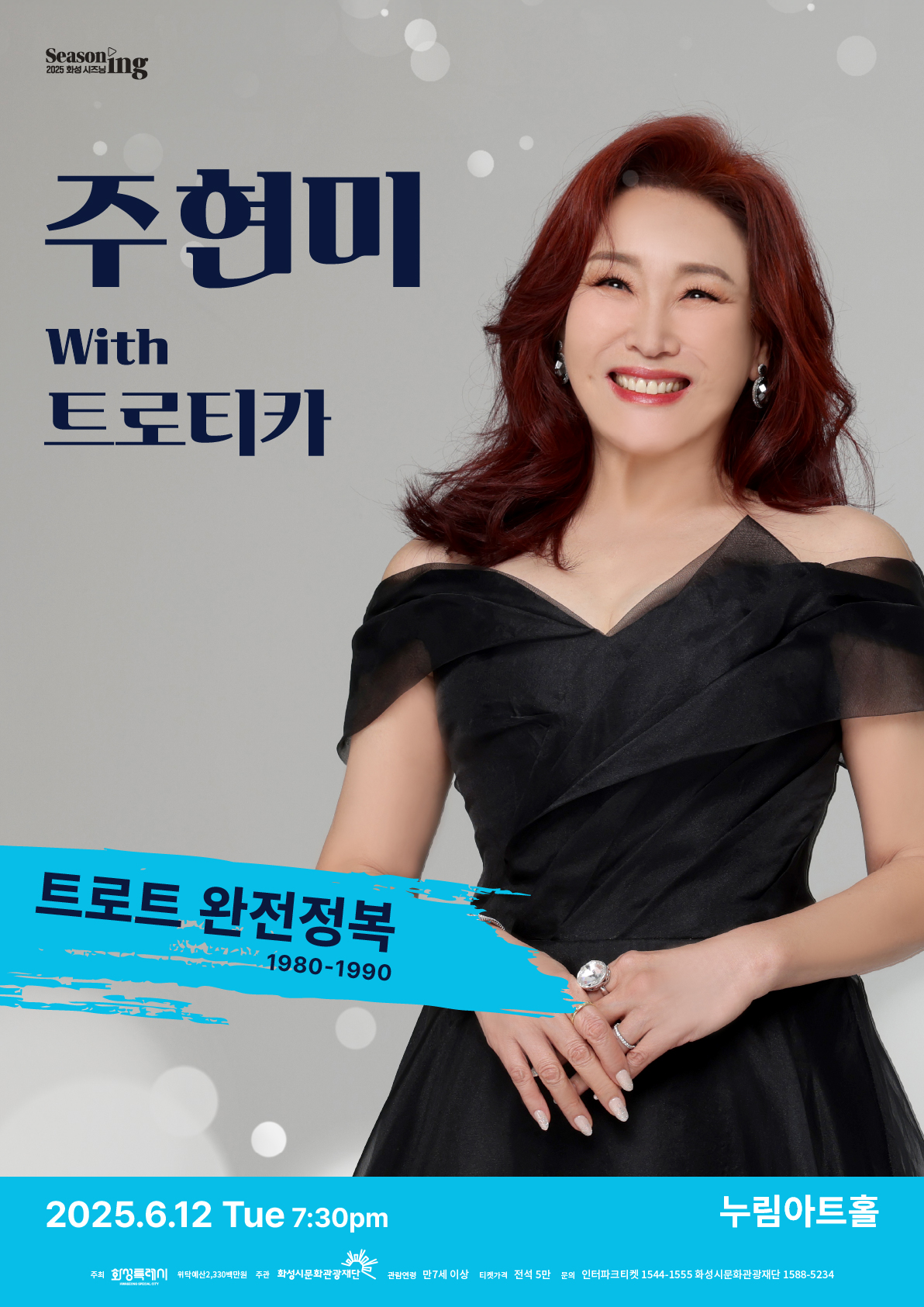 【[공 연]기획공연】주현미 with 트로티카 <트로트 완전정복2> 장소 누림아트홀 기간 2025년 6월 12일 ~ 2025년 6월 12일 요일 목 공연시간 19:30(80분) 티켓정보 전석 5만원 관람등급 만 7세 이상 관람가 문의 1588-5234 ※예매 바로가기 버튼은 2월 4일(화) 16시에 활성화됩니다. (06.12)주현미2_아트홀목록.jpg [ Size : 98.02KB, Down : 390 ] 미리보기 다운로드 (06.12)주현미2_아트홀목록 (25.06.12) 주현미 with 트로티카.jpg [ Size : 1.04MB, Down : 426 ] 미리보기 다운로드 (25.06.12) 주현미 with 트로티카 ㅈㅜㅎㅕㄴㅁㅣ2_ㅅㅏㅇㅅㅔㅍㅔㅇㅣㅈㅣ_ㅊㅚㅈㅗㅇ.jpg [ Size : 2.71MB, Down : 4,226 ] 미리보기 다운로드 ㅈㅜㅎㅕㄴㅁㅣ2_ㅅㅏㅇㅅㅔㅍㅔㅇㅣㅈㅣ_ㅊㅚㅈㅗㅇ 목록보기