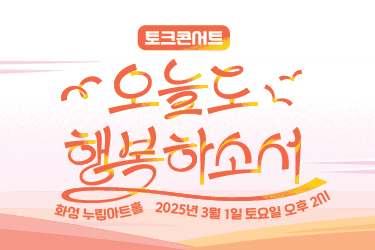 【[공 연]대관공연】토크콘서트 <오늘도 행복하소서> 장소 누림아트홀 기간 2025년 3월 1일 ~ 2025년 3월 1일 요일 토 공연시간 14:00 티켓정보 전석 무료 관람등급 전체연령 문의 0506-050-공육이팔 티켓예매: https://booking.naver.com/booking/5/bizes/1351037 오늘도행복하소서-목록이미지.jpeg [ Size : 101.49KB, Down : 198 ] 미리보기 다운로드 오늘도행복하소서-목록이미지 오늘도행복하소서-포스터.jpeg [ Size : 1.91MB, Down : 202 ] 미리보기 다운로드 오늘도행복하소서-포스터 오늘도행복하소서-상세이미지.jpeg [ Size : 4.49MB, Down : 485 ] 미리보기 다운로드 오늘도행복하소서-상세이미지 목록보기