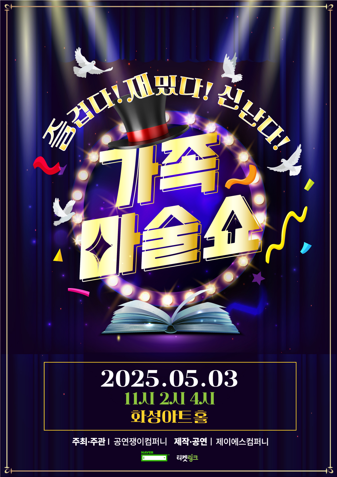 【[공 연]대관공연】가족마술쇼 장소 화성아트홀 기간 2025년 5월 3일 ~ 2025년 5월 3일 요일 토 공연시간 11:00, 14:00, 16:00 티켓정보 전석 2만원 관람등급 24개월 이상 문의 070-8080-일삼삼팔 티켓링크https://search.naver.com/search.naver?where=nexearch&sm=tab_etc&mra=bkkw&pkid=269&os=36552259&qvt=0&query=%EA%B0%80%EC%A1%B1%EB%A7%88%EC%88%A0%EC%87%BC%20%ED%99%94%EC%84%B1 가족마술쇼 목록 이미지.jpg [ Size : 32.5KB, Down : 199 ] 미리보기 다운로드 가족마술쇼 목록 이미지 가족마술쇼-1080px-final.jpg [ Size : 778.54KB, Down : 200 ] 미리보기 다운로드 가족마술쇼-1080px-final 상세페이지-시안-01.jpg [ Size : 668.71KB, Down : 761 ] 미리보기 다운로드 상세페이지-시안-01 목록보기
