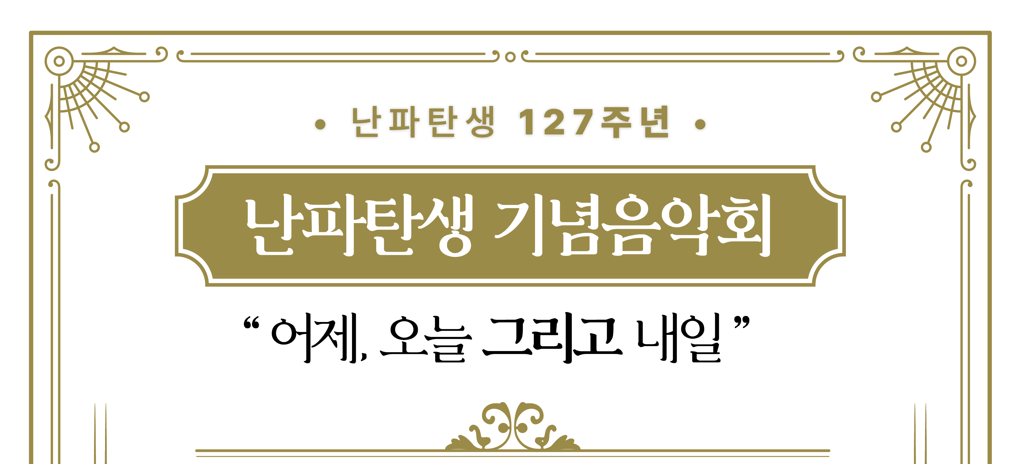【[공 연]대관공연】 난파탄생 127주년 난파탄생 기념음악회 “어제, 오늘 그리고 내일” 장소 모두누림센터 누림아트홀 기간 2025년 4월 26일 ~ 2025년 4월 26일 요일 토 공연시간 2025년 4월 26일(토) 17:00 (소요시간: 80분(인터미션 없음)) 티켓정보 전석 무료 관람등급 6세 이상 입장 가능 문의 010-3426-칠팔팔팔 화성음협 사이트에서 예매 가능https://hsmusic.modoo.at/?link=6khzrsgl 난파탄생음악회 목록이미지.png [ Size : 274.87KB, Down : 140 ] 미리보기 다운로드 난파탄생음악회 목록이미지 2025 난파탄생음악회.png [ Size : 4.68MB, Down : 163 ] 미리보기 다운로드 2025 난파탄생음악회 목록보기