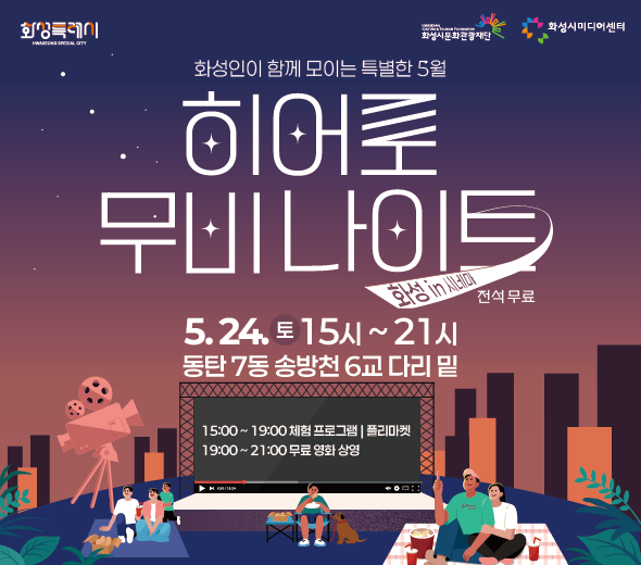5월 가정의 달을 맞이하여 화성시민들의 문화향유 기회 확대를 위해 화성시미디어센터‘화성 in 시네마’에서 도심 속 공원을 활용하여 다양한 체험과 영화 상영으로 화성시민들을 찾아갑니다!