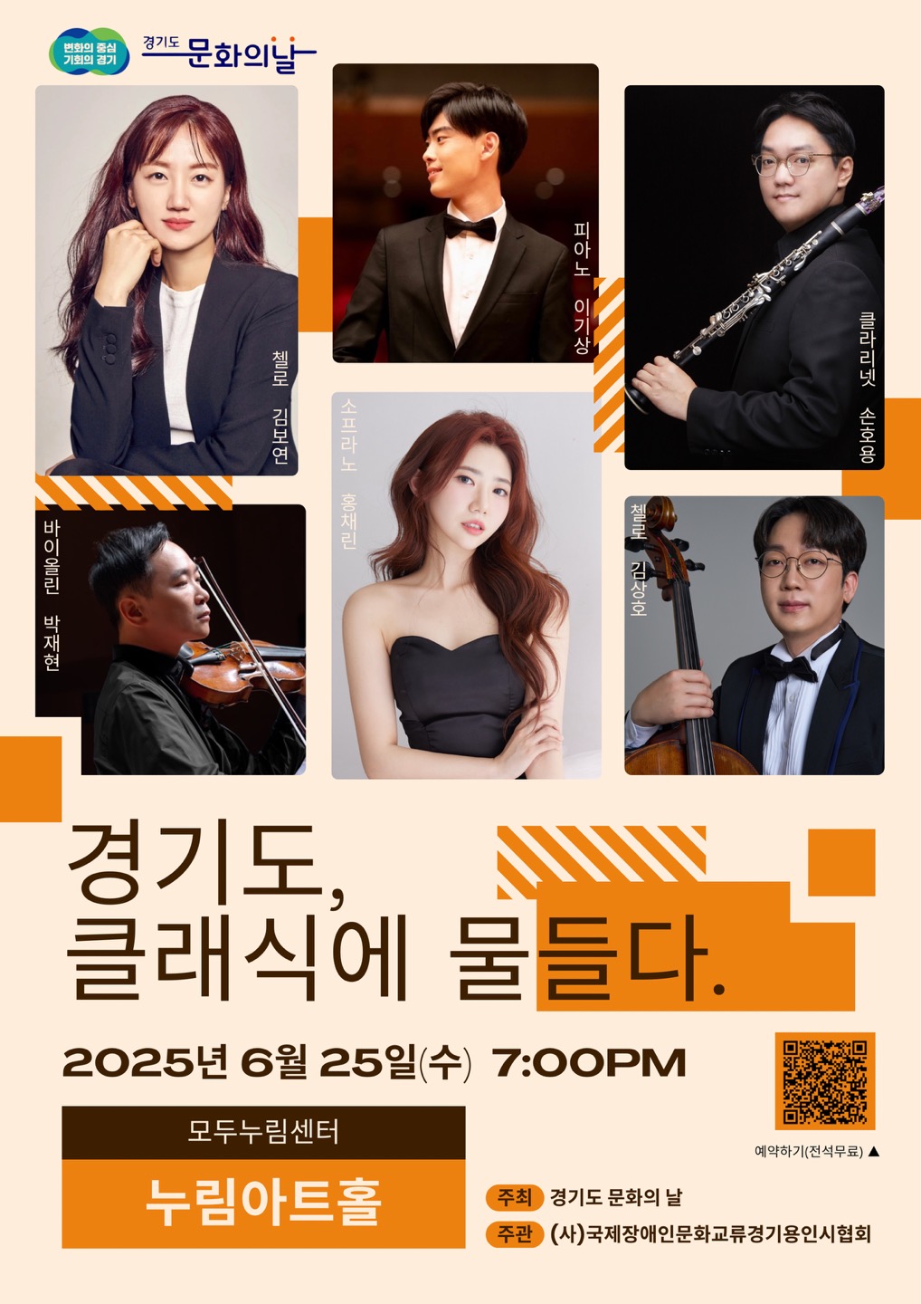 【[공 연]대관공연】경기도, 클래식에 물들다. 장소 누림아트홀 기간 2025년 6월 25일 ~ 2025년 6월 25일 요일 수 공연시간 19:00 티켓정보 전석 무료 (1인 1티켓) 관람등급 전 연령 관람 가능 문의 010-5646-구구삼팔 많은 관심 바랍니다. 누림아트홀포스터1.jpeg [ Size : 276.15KB, Down : 129 ] 미리보기 다운로드 누림아트홀포스터1 0625-포스터1.png [ Size : 3.9MB, Down : 285 ] 미리보기 다운로드 0625-포스터1 0625-포스터2.png [ Size : 1.84MB, Down : 265 ] 미리보기 다운로드 0625-포스터2 목록보기