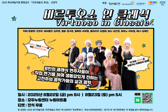 【[공 연]대관공연】 비르투오소 인 클래식 장소 모두누림센터 누림아트홀 기간 2025년 8월 22일 ~ 2025년 8월 23일 요일 금, 토 공연시간 2025년 8월 22일(금) 20:00, 23일(토) 17:00, 소요시간 80분 티켓정보 전석 무료(하단의 링크를 통해 사전예약 필요) 관람등급 7세이상 (2019년 이하 출생) 문의 010-5225-공팔오팔 예매처 : https://naver.me/G4GmYKll 문의 : 010-5225-공팔오팔 화성시홈페이지_목록이미지.jpg [ Size : 99.53KB, Down : 54 ] 미리보기 다운로드 화성시홈페이지_목록이미지 화성시홈페이지_포스터.jpg [ Size : 1.62MB, Down : 68 ] 미리보기 다운로드 화성시홈페이지_포스터 화성시홈페이지_상세이미지.jpg [ Size : 2.57MB, Down : 169 ] 미리보기 다운로드 화성시홈페이지_상세이미지 목록보기