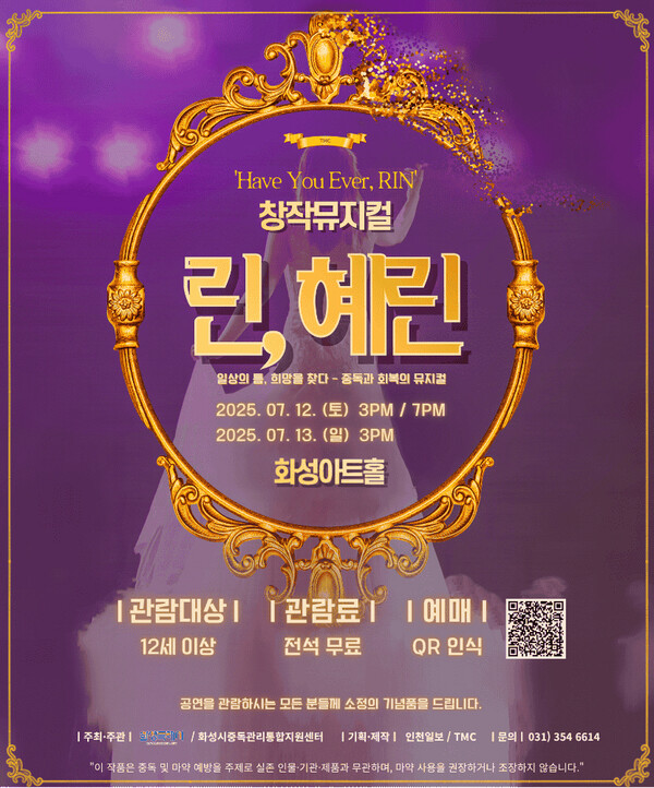 【[공 연]대관공연】뮤지컬 <린, 혜린> 장소 유앤아이센터 화성아트홀 기간 2025년 7월 12일 ~ 2025년 7월 13일 요일 토, 일 공연시간 2025년 7월 12일(토) 15:00, 19:00, 13일(일) 15:00 (소요시간 100분) 티켓정보 전석 무료, 사전등록 필요 관람등급 12세 이상 문의 031-354-6614 예매 링크https://www.playticket.co.kr/nav/detail.html?idx=3655 목록이미지_린, 혜린.jpg [ Size : 234.71KB, Down : 59 ] 미리보기 다운로드 목록이미지_린, 혜린 포스터.jpg [ Size : 166.99KB, Down : 376 ] 미리보기 다운로드 포스터 목록보기