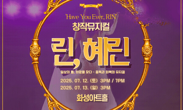 【[공 연]대관공연】뮤지컬 <린, 혜린> 장소 유앤아이센터 화성아트홀 기간 2025년 7월 12일 ~ 2025년 7월 13일 요일 토, 일 공연시간 2025년 7월 12일(토) 15:00, 19:00, 13일(일) 15:00 (소요시간 100분) 티켓정보 전석 무료, 사전등록 필요 관람등급 12세 이상 문의 031-354-6614 예매 링크https://www.playticket.co.kr/nav/detail.html?idx=3655 목록이미지_린, 혜린.jpg [ Size : 234.71KB, Down : 66 ] 미리보기 다운로드 목록이미지_린, 혜린 포스터.jpg [ Size : 166.99KB, Down : 405 ] 미리보기 다운로드 포스터 목록보기
