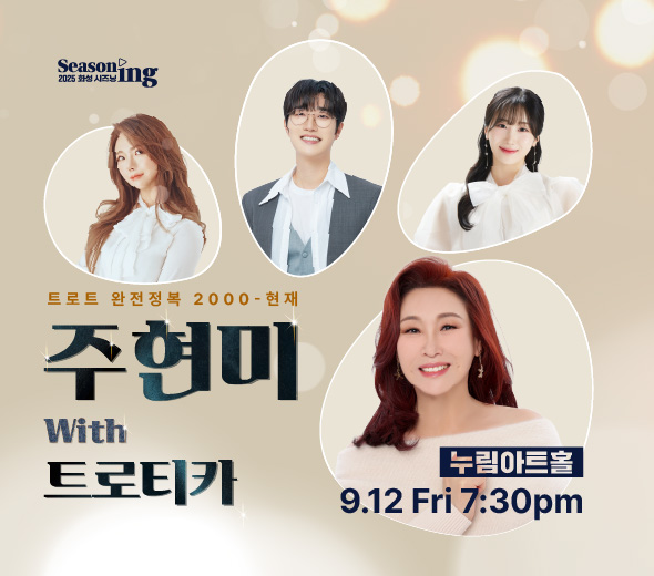 【공 연】주현미 with 트로티카 <트로트 완전정복3> 장소 누림아트홀 기간 2025년 9월 12일 ~ 2025년 9월 12일 요일 금 공연시간 19:30(80분) 티켓정보 전석 5만원 관람등급 8세(초등학생) 이상 관람가 문의 1588-5234 Seasoning 2025 트로트 완전정복 2000-현재 주현미 with 트로티카 누림아트홀 9.12 Fri 7:30pm 문화캘린더_590x520 (2).jpg [ Size : 141.86KB, Down : 54 ] 미리보기 다운로드 문화캘린더_590x520 (2) 목록보기