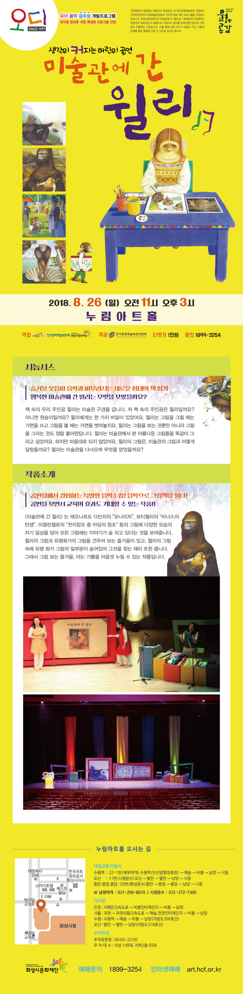 【[공 연]기획공연】미술관에 간 윌리 장소 모두누림센터 누림아트홀 기간 2018년 8월 26일 ~ 2018년 8월 26일 공연시간 오전 11시, 오후 3시 티켓정보 전석 1만원 관람등급 만24개월 이상 문의 1899-3254 . 미술관에간윌리1.jpg [ Size : 126.4KB, Down : 434 ] 미리보기 다운로드 미술관에간윌리2.jpg [ Size : 1.35MB, Down : 3,080 ] 미리보기 다운로드 목록보기