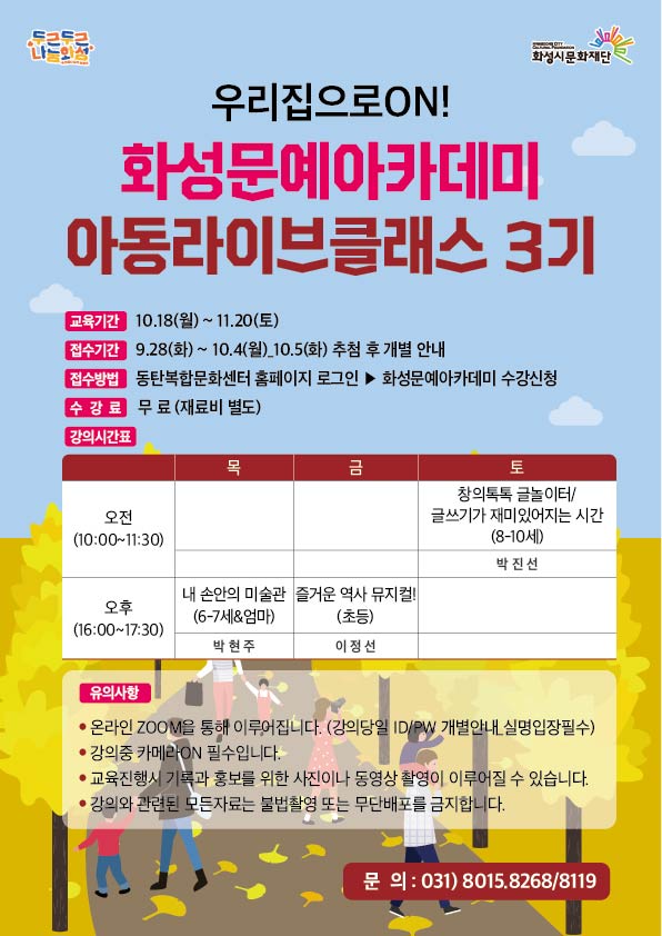 화성문예아카데미 아동라이브클래스 3기 수강생 모집 안내 작성자 관리자 작성일 2021년 9월 27일 17시 15분 8초 조회 591 화성문예아카데미_아동라이브 3기_대지 1 사본.jpg [ Size : 119.84KB, Down : 500 ] 미리보기 다운로드 화성문예아카데미_아동라이브 3기_대지 1 사본 ★강의계획서 보러가기 https://bit.ly/3CNdBBA★ 목록보기