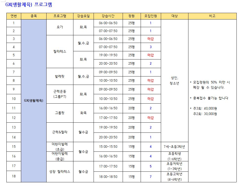 ※수영(성인,청소년) : 새벽수영(진도.마스터즈), 오전수영(진도.마스터즈), 저녁수영(진도.마스터즈), 아쿠아로빅, 청춘반은
