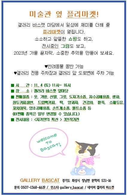 [대관료지원사업] 자기만의 픽션 <FICTION of ONE’S OWN> 작성자 관리자 작성일 2023년 10월 23일 17시 15분 27초 조회 408 KakaoTalk_20231020_141220388.jpg [ Size : 130.89KB, Down : 300 ] 미리보기 다운로드 KakaoTalk_20231020_141220388 변경주_전시회(플리마켓).jpg [ Size : 98.83KB, Down : 61 ] 미리보기 다운로드 변경주_전시회(플리마켓) <자기만의 픽션 - FICTION of ONE’S OWN> ○ 전시장소 : 갤러리 바스캣 (화성시 정남면 문학리 531-16 2층 1호)○ 전시기간 : 2023. 10. 28.(토) ~ 2023. 11. 12.(일)○ 무료전시* 화성시, 화성시문화재단 대관료 지원사업 지원을 받아 진행됩니다 * ○ 화성시민여러분의 많은 관람 부탁드립니다. 목록보기