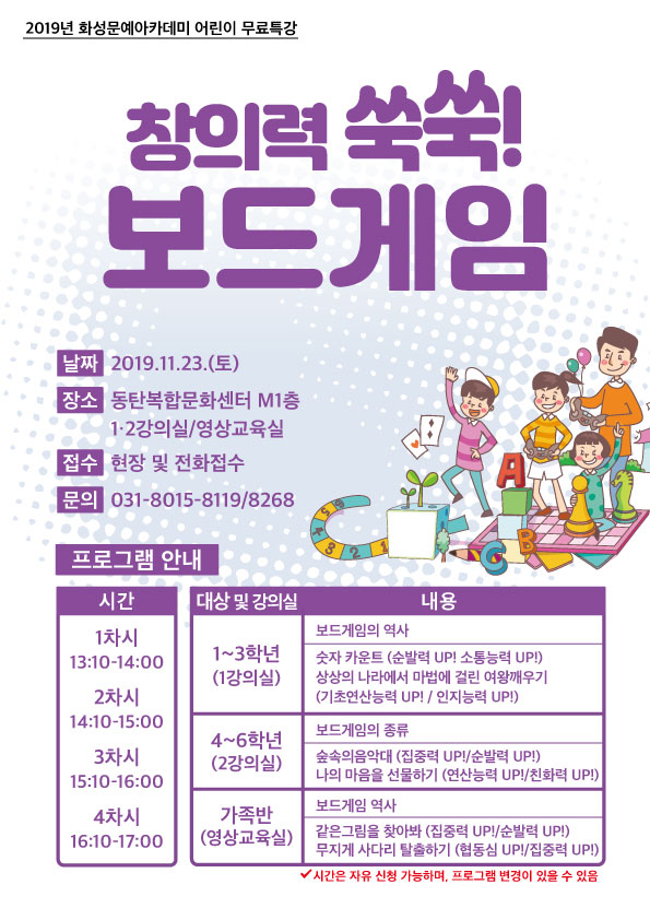[화성문예아카데미] 화성문예아카데미 11월 특별강좌 안내 작성자 관리자 작성일 2019년 10월 30일 17시 6분 24초 조회 1,646 보드게임특강A4.jpg [ Size : 131.35KB, Down : 1,751 ] 미리보기 다운로드 목록보기