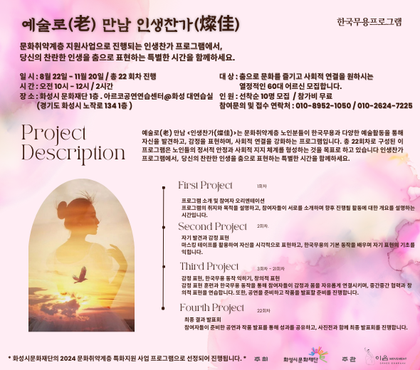 ○내용 : 예술로(老) 만남 <인생찬가(燦佳)>는 문화취약계층 노인분들이 한국무용과 다양한 예술활동을 통해 자신을 발견하고, 감정을 표현하며, 사회적 연결을 강화하는 프로그램입니다. 총 22회차로 구성된 이 프로그램은 노인들의 정서적 안정과 사회적 지지 체계를 형성하는 것을 목표로 하고 있습니다.