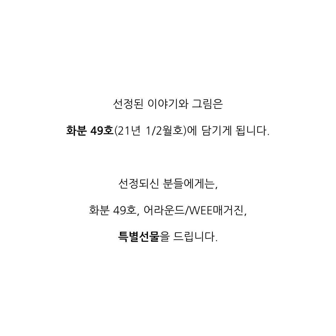 선정된 이야기와 그림은 매거진[화분] 49호(2021년 1/2월호) PEOPLE 페이지에 담기게 됩니다.