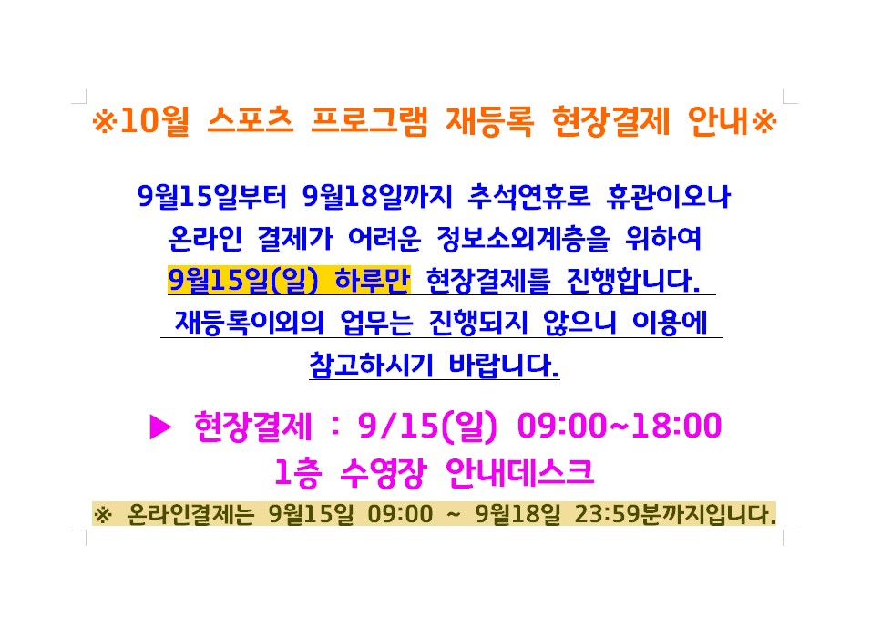 [스포츠] 10월 스포츠 프로그램 재등록 현장결제 안내 작성자 관리자 작성일 2024년 9월 9일 16시 37분 42초 조회 1,692 10월 스포츠 프로그램 재등록 현장결제 안내.jpg [ Size : 124.65KB, Down : 468 ] 미리보기 다운로드 10월 스포츠 프로그램 재등록 현장결제 안내 목록보기