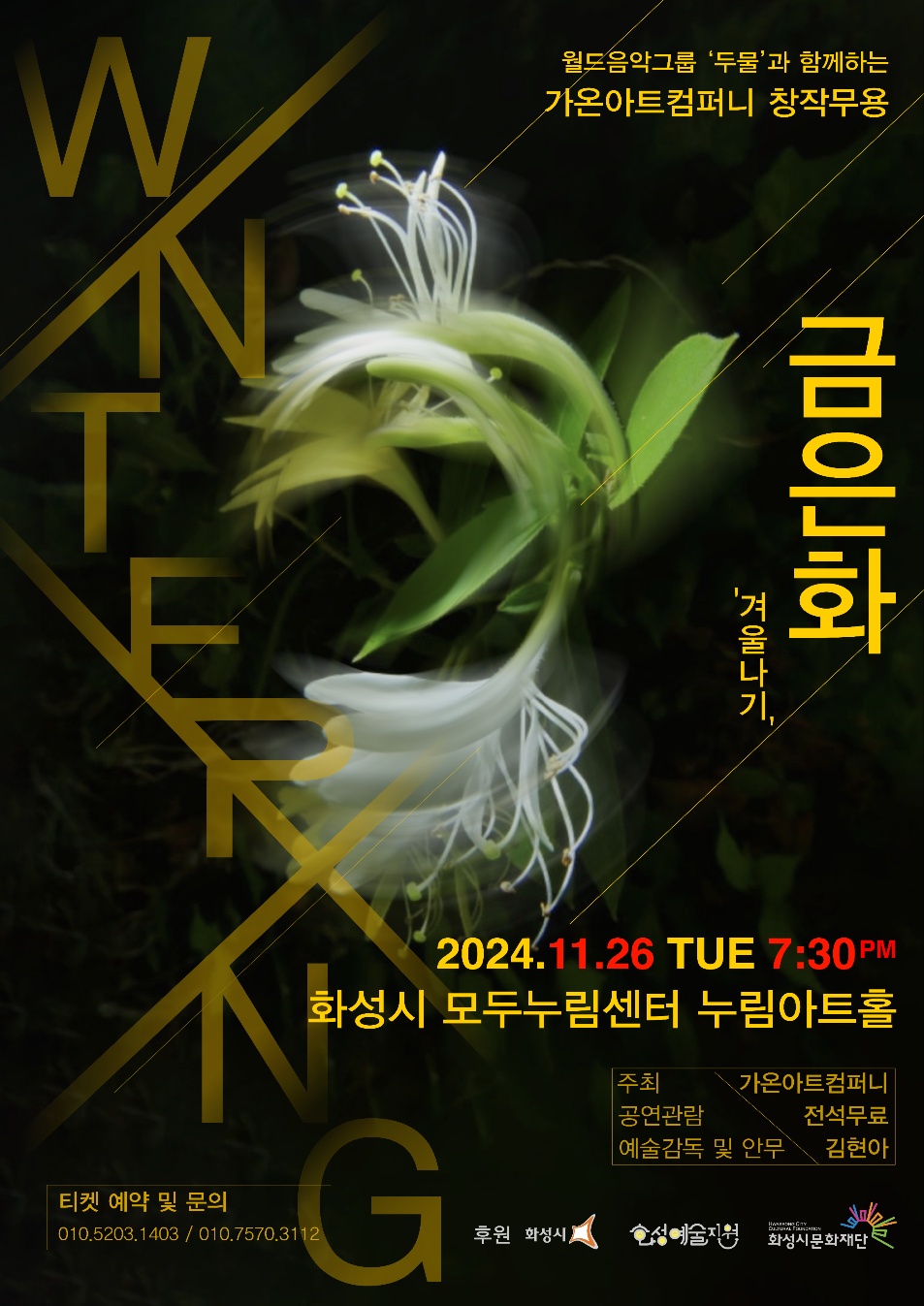 [2024 화성예술활동지원] 11/26(화) 19:30 가온아트컴퍼니-금은화'겨울나기' 작성자 관리자 작성일 2024년 10월 23일 14시 19분 15초 조회 742 홍보이미지(가온아트컴퍼니).jpg [ Size : 310.98KB, Down : 644 ] 미리보기 다운로드 홍보이미지(가온아트컴퍼니) 금은화_팜플렛.png [ Size : 3.07MB, Down : 91 ] 미리보기 다운로드 금은화_팜플렛 금은화_팜플레(1).png [ Size : 4.4MB, Down : 94 ] 미리보기 다운로드 금은화_팜플레(1) < 2024 화성예술활동지원> 선정작□ 공 연 : 창작무용극 <금은화-겨울나기>□ 일 시 : 2024. 11. 26.(화) 19:30□ 장 소 : 누림아트홀 □ 예 매 : 전석무료 ㅇ1ㅇ-5203-1403 / ㅇ1ㅇ-7570-3112□ 감독/안무 : 김현아 □ 주 최 : 가온아트컴퍼니□ 후 원 : 화성시, 화성시문화재단본 공연은 화성시, 화성시문화재단의 <2024 화성예술활동지원> 사업의 지원을 받아 제작되었습니다. 목록보기