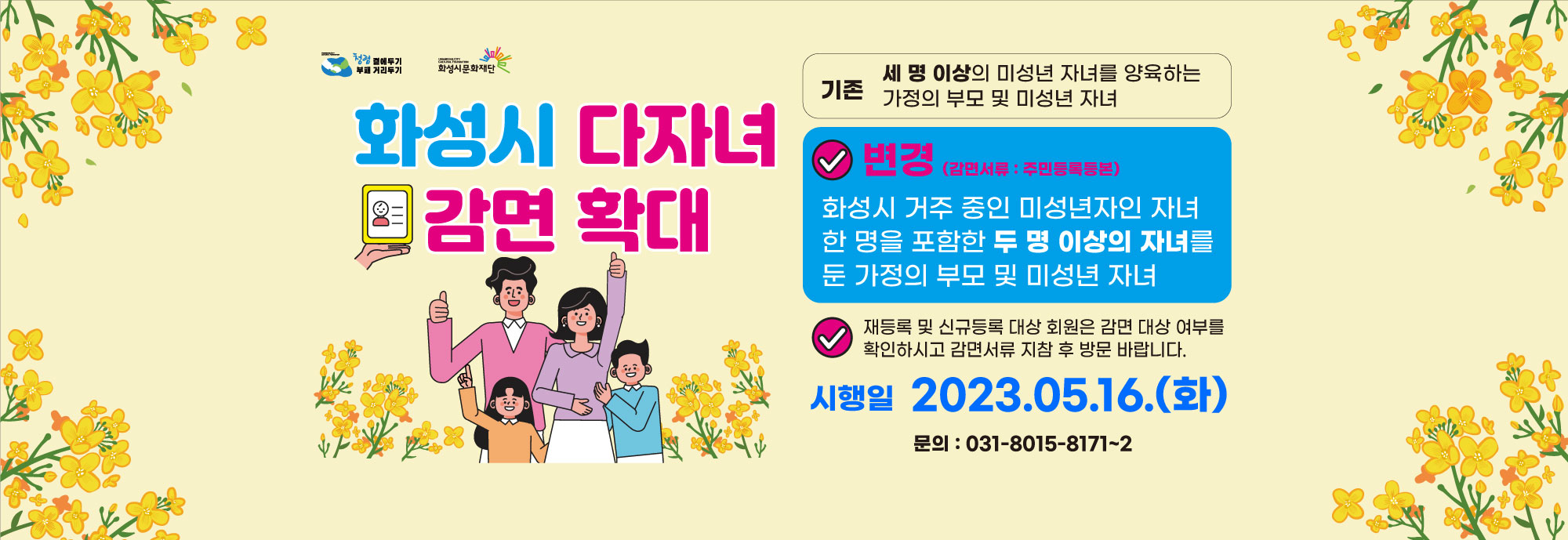 기존 세 자녀에서 화성시 거주 중인 미성년자인 자녀 한 명을 포함한 두 명 이상의 자녀를 둔 가정의 부모와 미성년의 자녀가 감면 혜택을 받을 수 있도록 기준이 확대되었습니다.