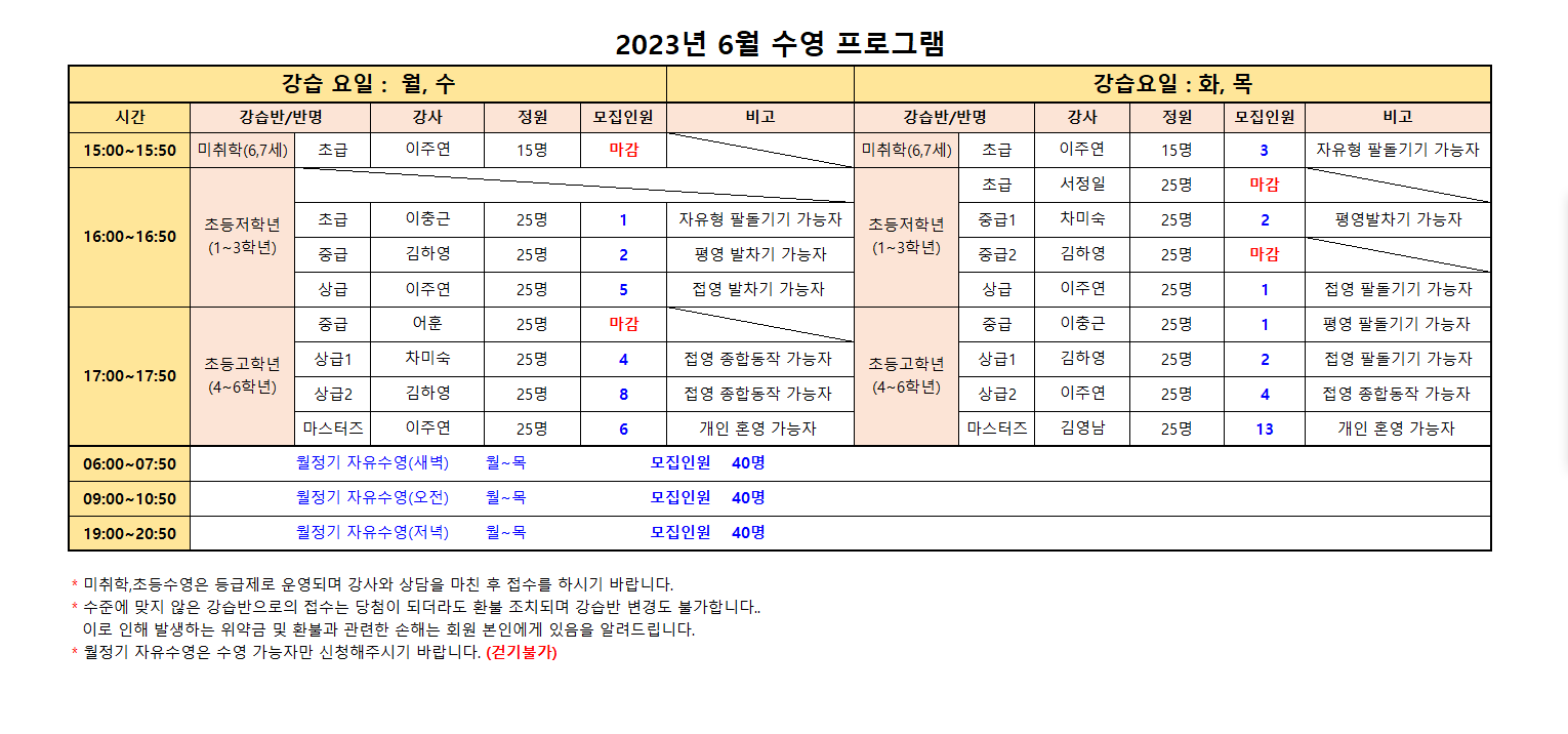수준에 맞지 않은 강습반으로의 신규접수는 당첨이 되더라도 환불 조치되며 강습반 변경도 불가합니다..