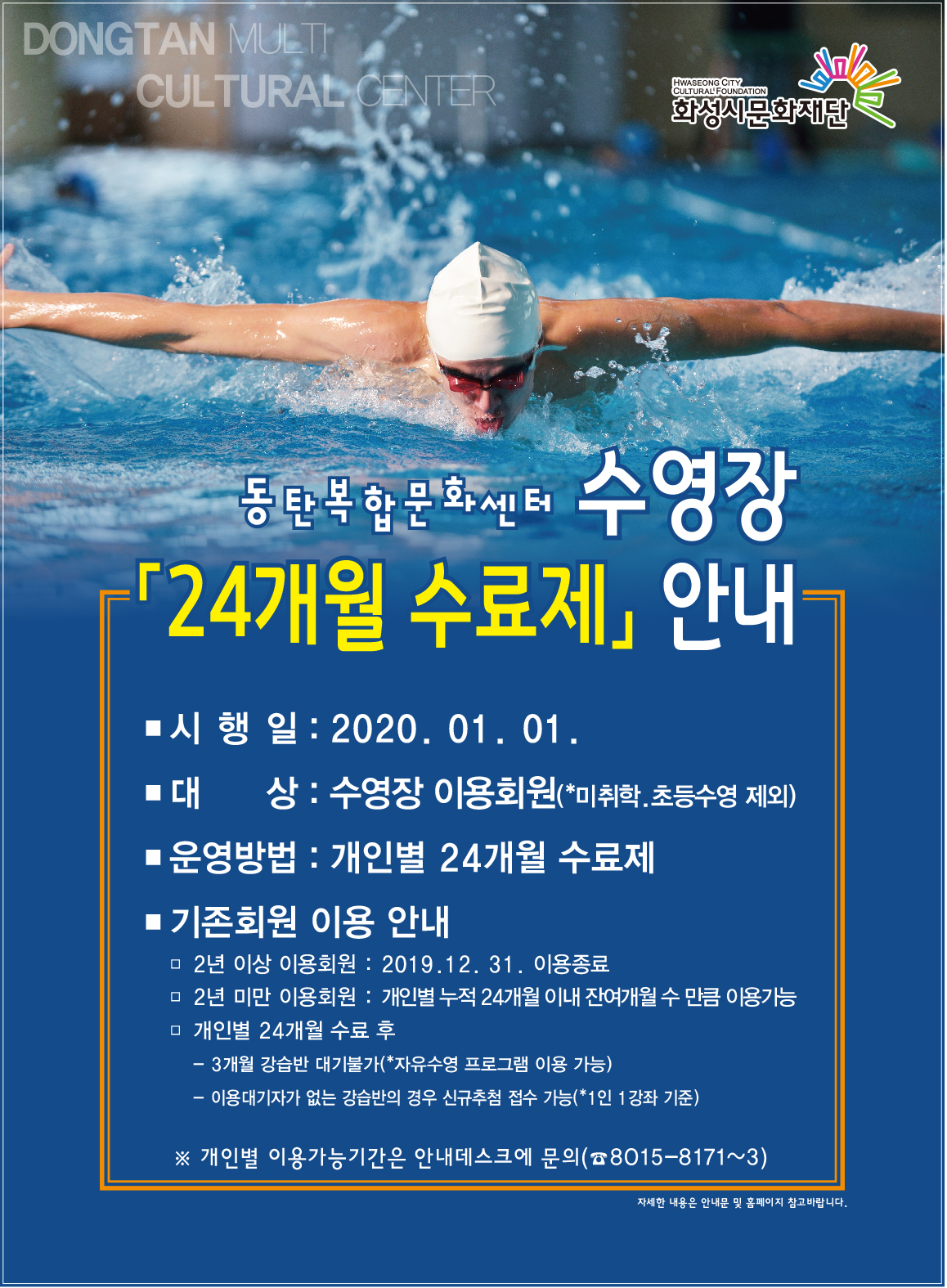 [스포츠] 동탄복합문화센터 수영장 '24개월 수료제' 안내 작성자 관리자 작성일 2019년 11월 7일 17시 31분 17초 조회 2,771 동탄복합문화센터 수료제안내.jpg [ Size : 1.26MB, Down : 4,017 ] 미리보기 다운로드 동탄복합문화센터 수영장 '24개월 수료제' 가 오는 2020년 1월 1일 부로 시행됨을 알려드립니다. 목록보기