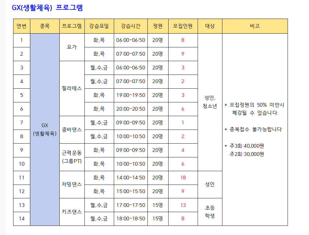 ▶ GX(생활체육): 요가, 필라테스, 줌바댄스, 근력운동(그룹PT), 차밍댄스, 키즈댄스 운영