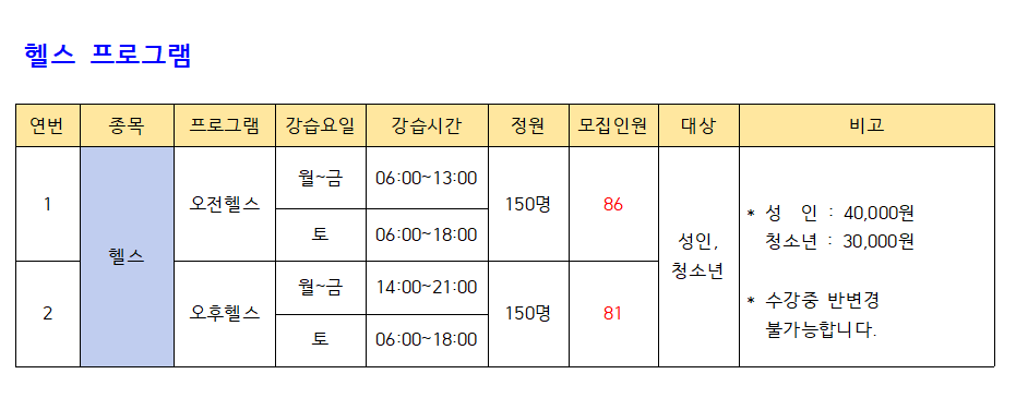 ▶ 헬스 : 오전헬스, 오후헬스 운영