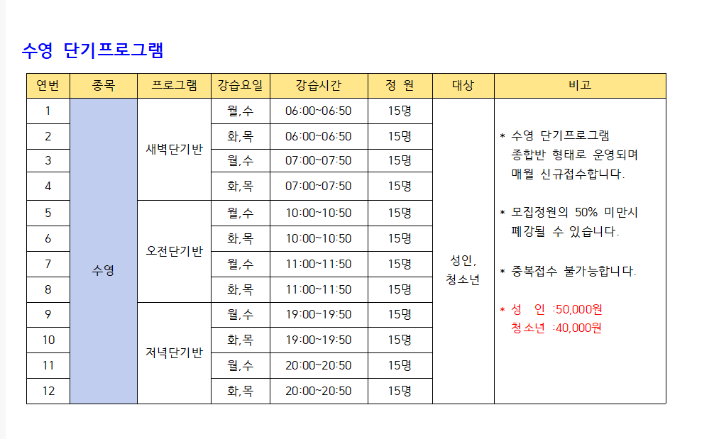 ▶ 비고 : 1. 수영 단기반은 매월 신규접수합니다.