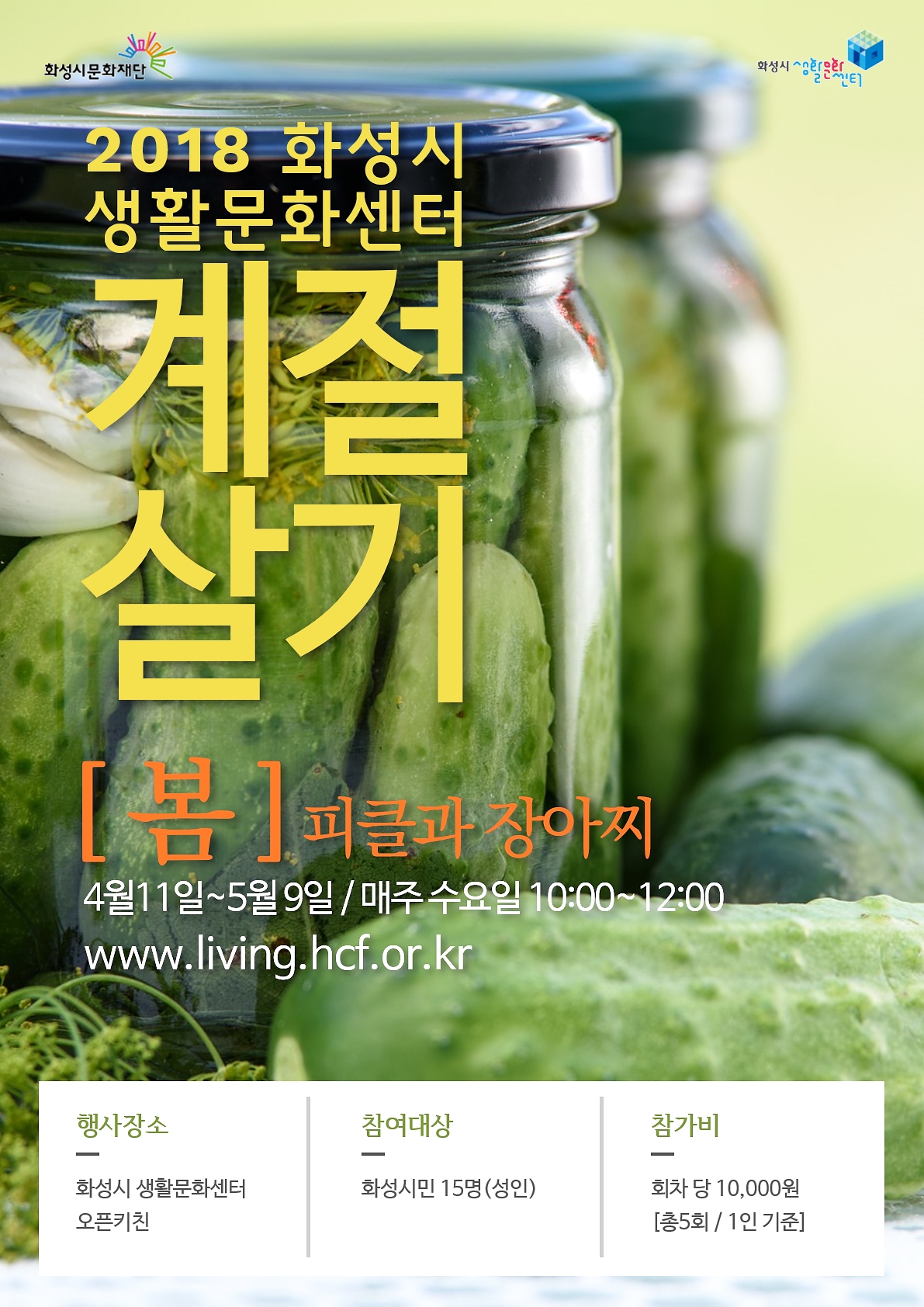 [화성시생활문화센터] 2018 계절살기 [봄: 피클과 장아찌] 작성자 관리자 작성일 2018년 4월 30일 18시 23분 15초 조회 841 계절살기.jpg [ Size : 956.58KB, Down : 455 ] 미리보기 다운로드 신청하기 ☞ click 목록보기