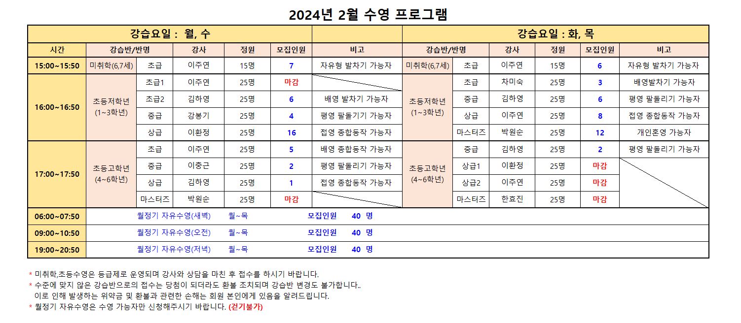 수준에 맞지 않은 강습반으로의 신규접수는 당첨이 되더라도 환불 조치되며 강습반 변경도 불가합니다..