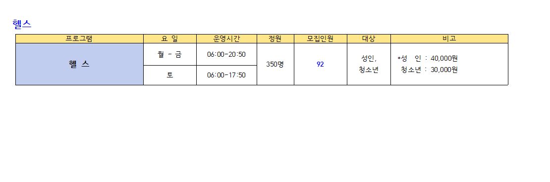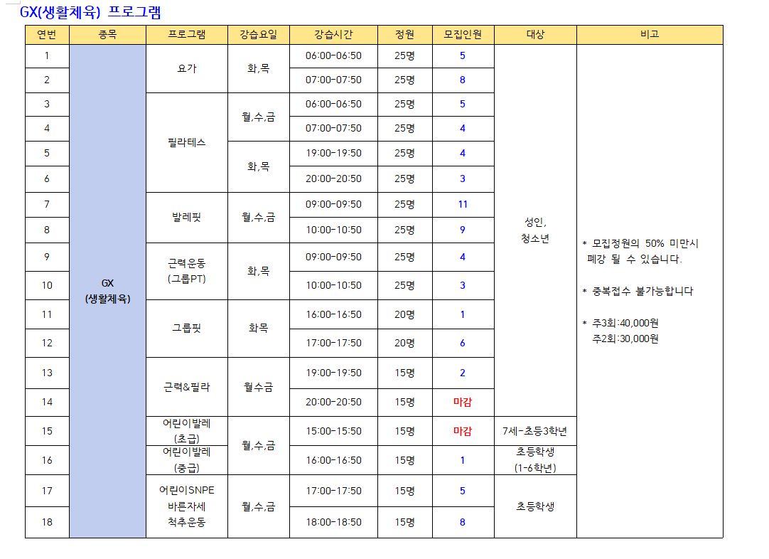 ● 모집프로그램: 수영(미취학. 초등저학년. 초등고학년, 월정기자유수영), GX(생활체육), 헬스