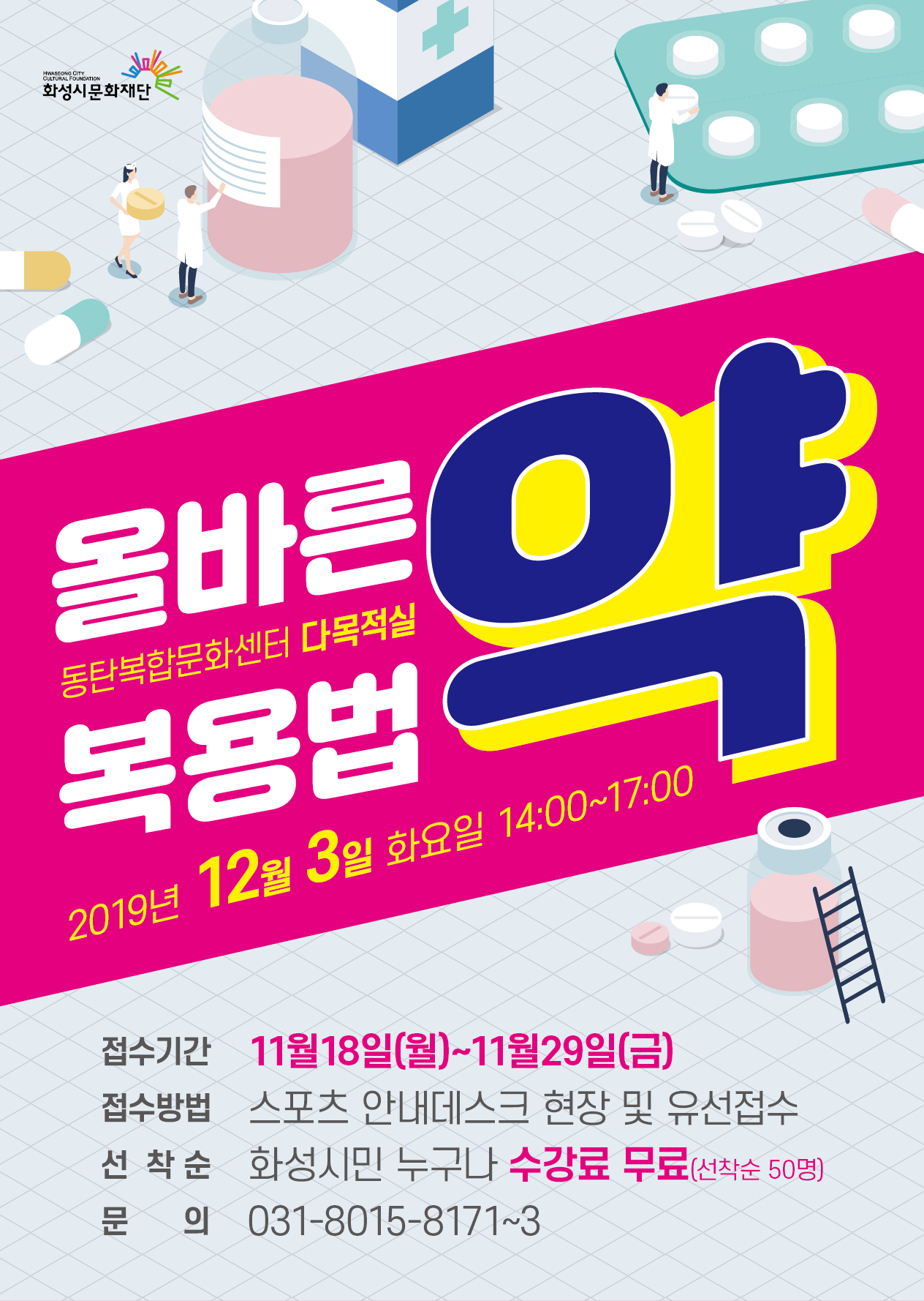 동탄복합문화센터 올바른 약 복용법 특강 <약> 작성자 관리자 작성일 2019년 11월 8일 17시 38분 9초 조회 860 1022동탄복합문화센터-약복용법(전단지)180AT,단면,A4-시안.jpg [ Size : 958.3KB, Down : 637 ] 미리보기 다운로드 동탄복합문화센터 올바른 약 복용법 특강 <약>2019년 12월 3일 (화) 14:00 - 17:00 동탄복합문화센터 다목적실화성시민 누구나 무료!!선착순 접수접수기간 : 11월18일~11월29일문의:031-8015-8171~3 목록보기