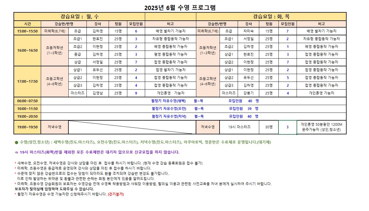 *미취학, 초등수영은 등급제로 운영되며 반드시 강사와 상담을 마친 후 접수를 하시기 바랍니다.