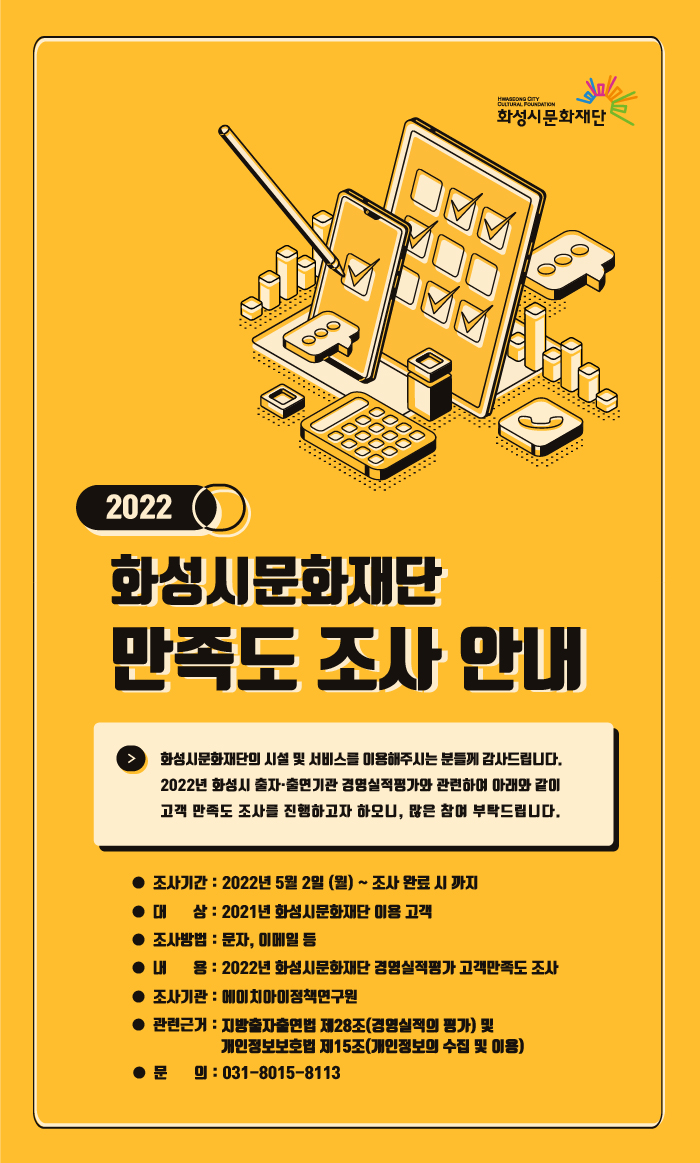 2022년 화성시문화재단 만족도조사 안내 작성자 관리자 작성일 2022년 4월 20일 15시 56분 22초 조회 312 화성시문화재단-고객만족도-조사-(web).jpg [ Size : 427.05KB, Down : 223 ] 미리보기 다운로드 화성시문화재단-고객만족도-조사-(web) 2022년 화성시문화재단 만족도조사 안내 목록보기